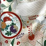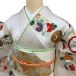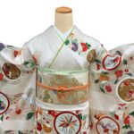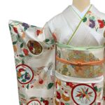 雅やかな円文に四季の花々と御所車が描かれた、格調高い訪問着。