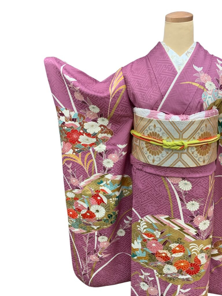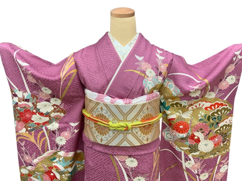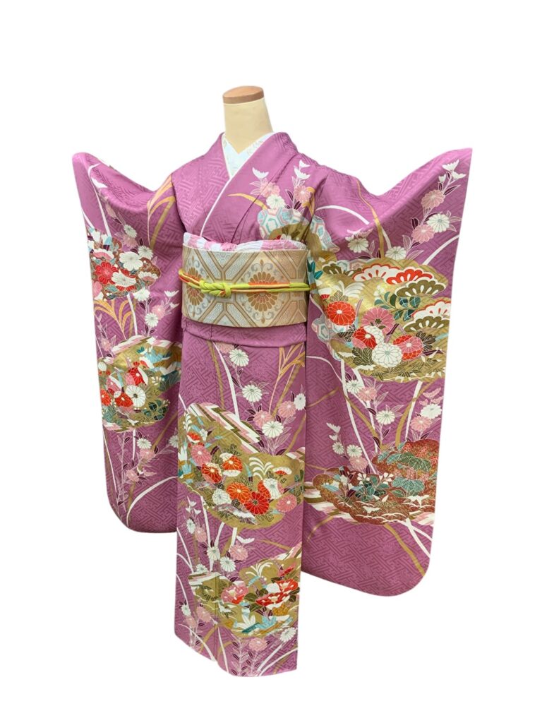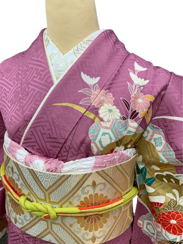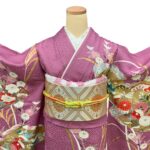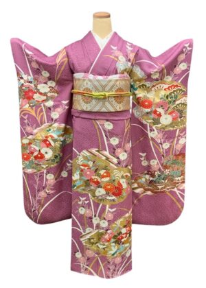 やわらかな青みがかったピンクに、 四季の花々が織りなす優美な世界。 地紋には格式高い亀甲文様が織り込まれ、 品格と華やかさを併せ持つ一着です。 草花や御所車、貝桶など古典文様が描かれ、 成人式はもちろん、格式ある式典にもふさわしい振袖です。 帯や小物の組み合わせで、 可愛らしくも凛とした雰囲気にも仕上がります。