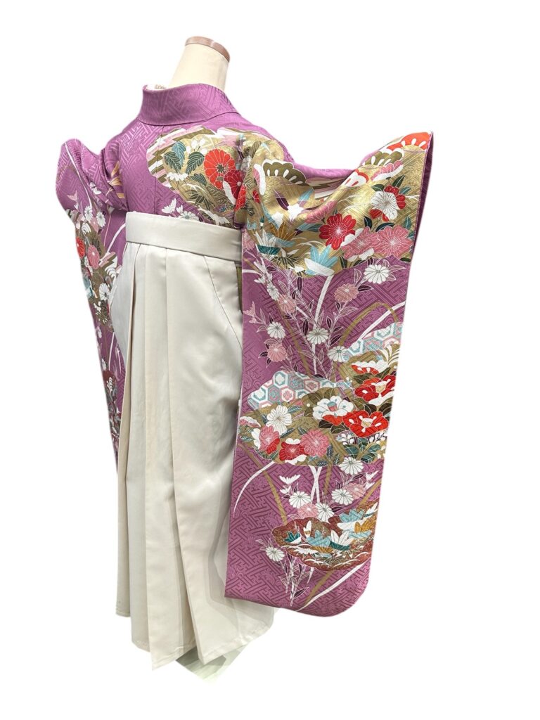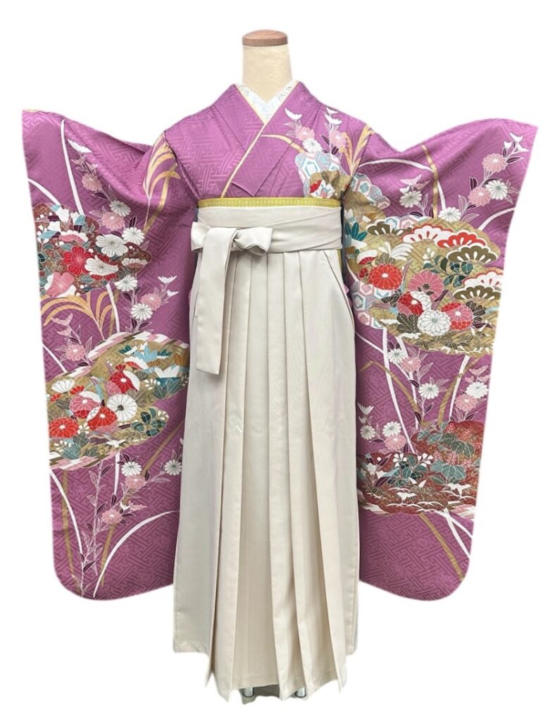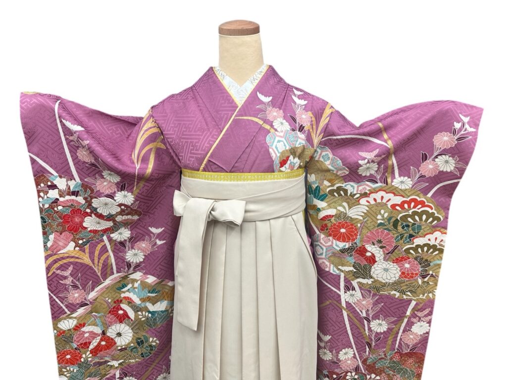 【セット内容】 振袖 帯 袴 【オプション追加】 ※在庫切れの場合もございます 長襦袢 刺繍衿 伊達衿 帯揚げ 帯締め 【サイズ】 身丈:162cm(背から) 袖丈:107cm 裄丈:68cm 帯長さ:428㎝ 帯幅:30.9㎝ 適応身長:165㎝くらいまで