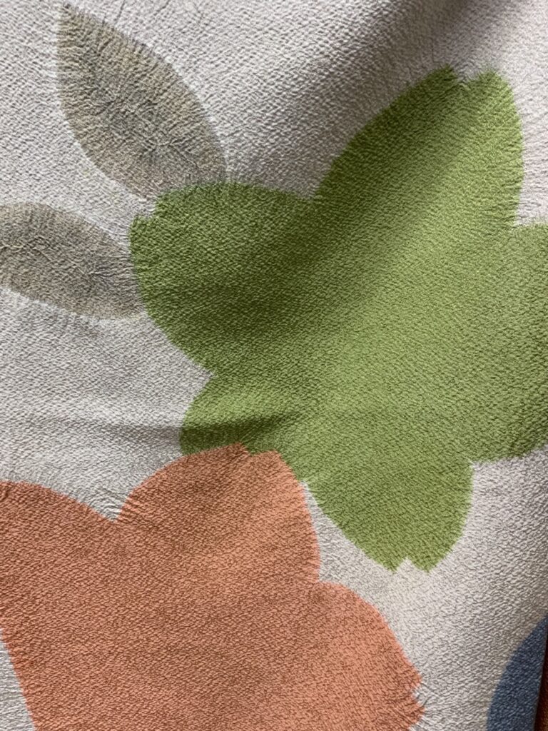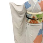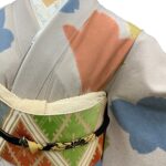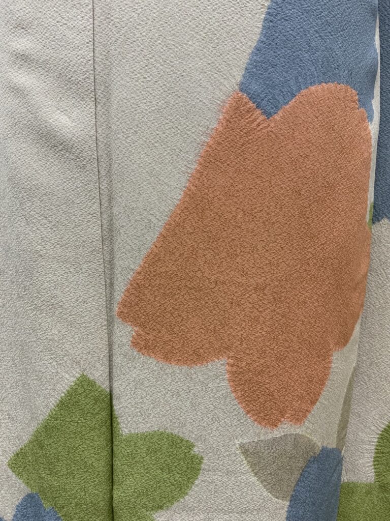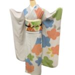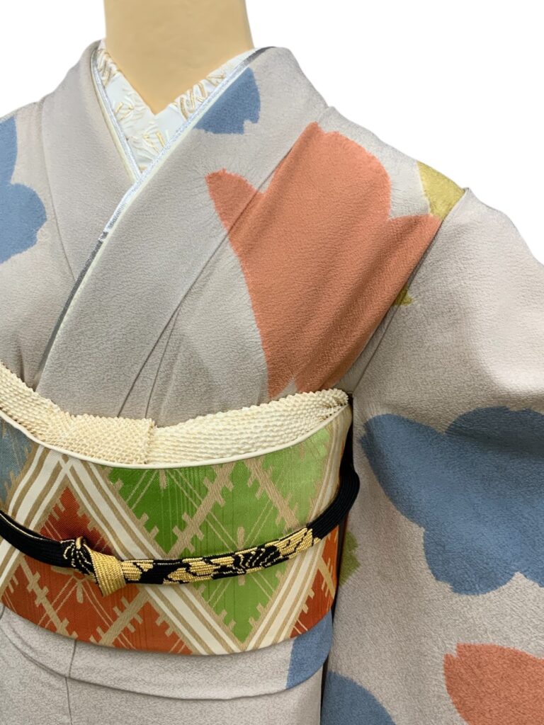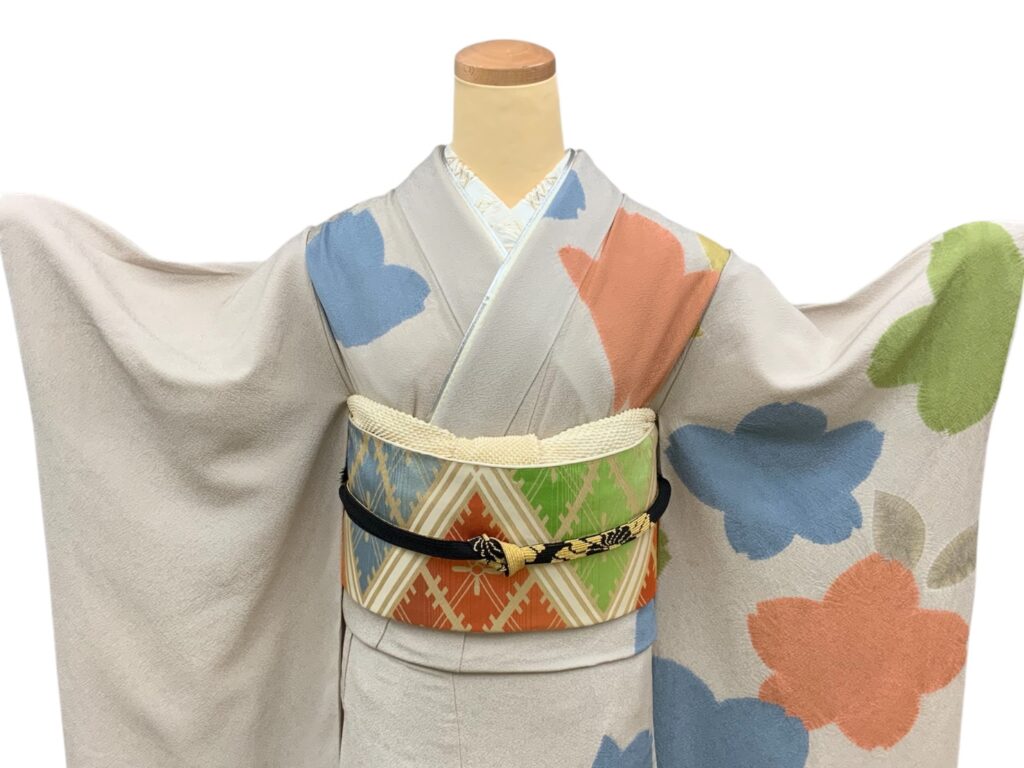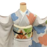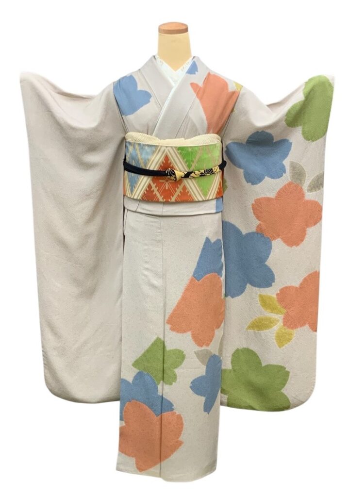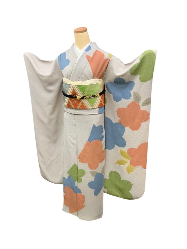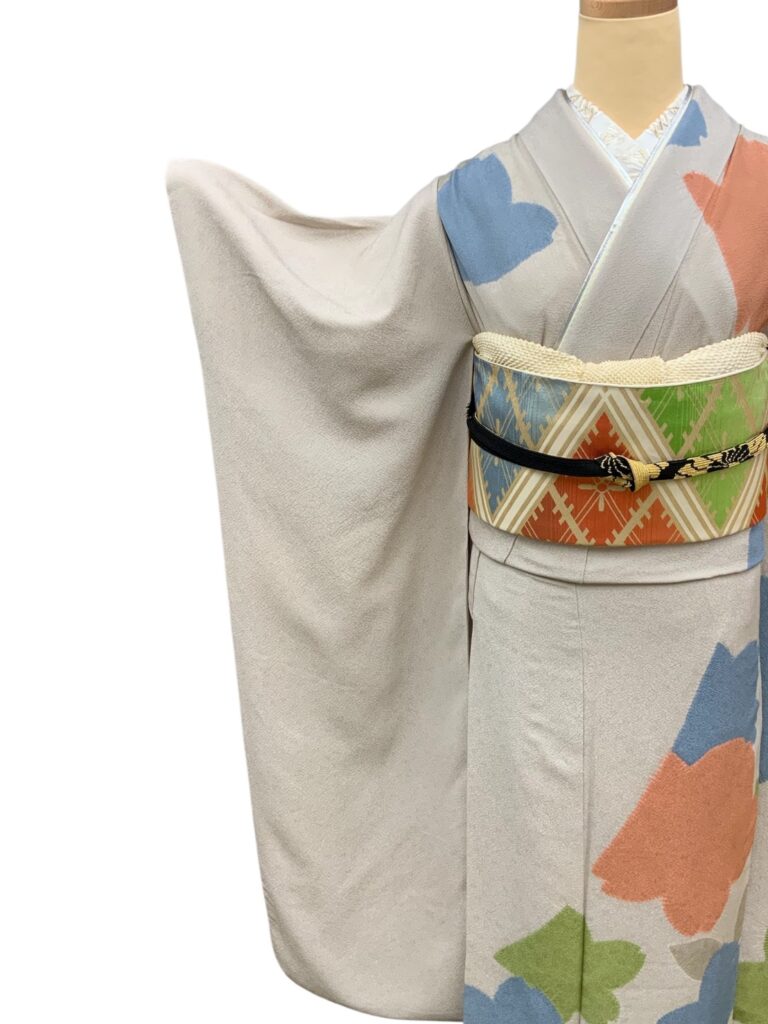 白味をおびたグレーの地色に、 ブルー・オレンジ・グリーンなどの カラーで描かれた大胆な葉文様が印象的な振袖です。 モダンで洗練された配色が目を惹き、 写真映えも抜群。 人と差をつけたい、 感度の高いお嬢様におすすめの一着です。 レトロと現代のエッセンスが絶妙に融合した、 唯一無二の存在感 振袖★★★★☆ Bランク