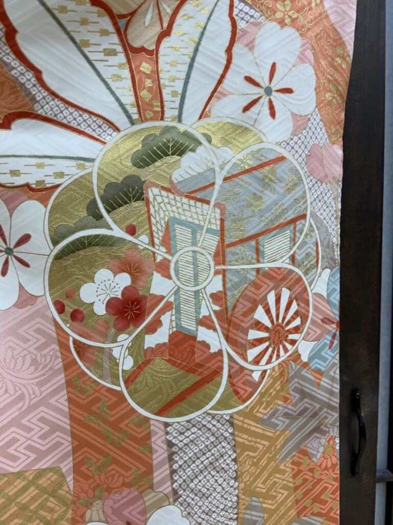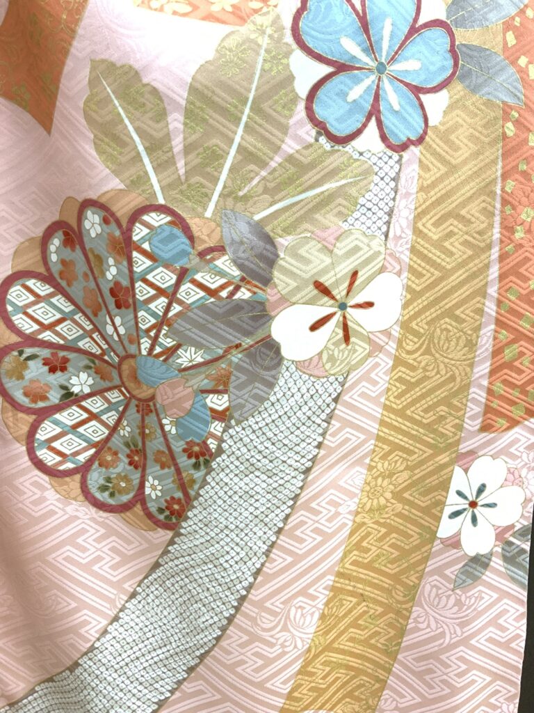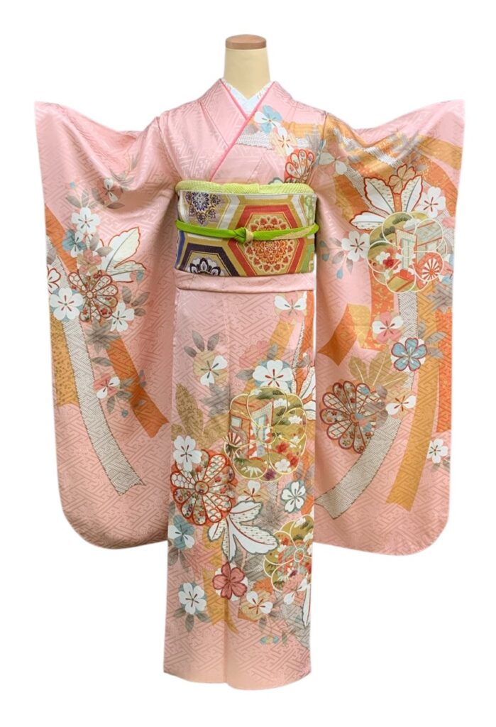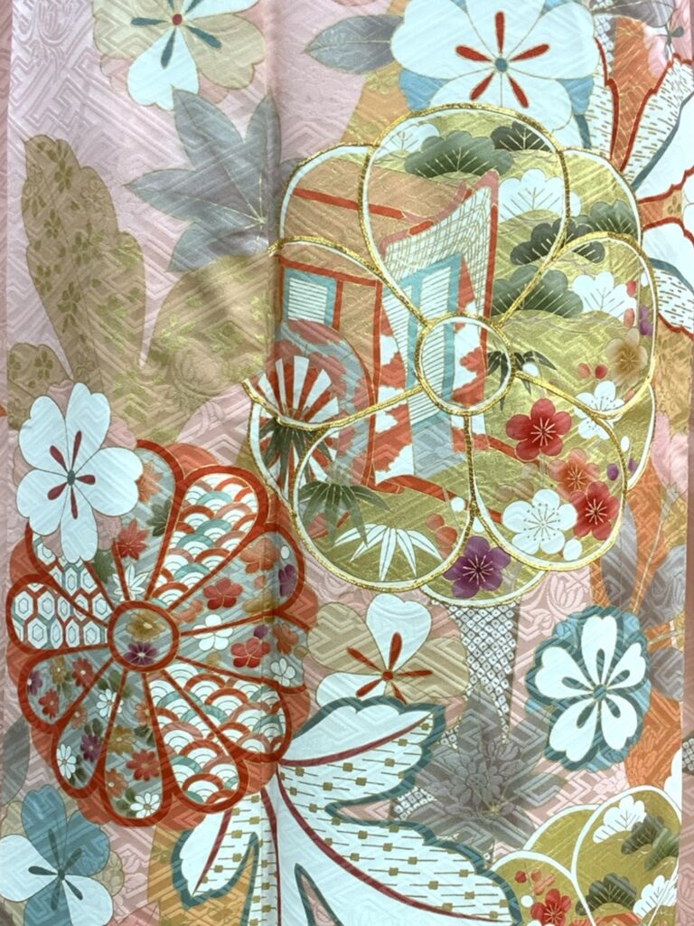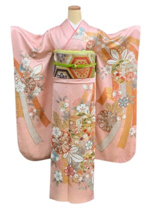 四季折々の花々や御所車を配した華やかな振袖です。