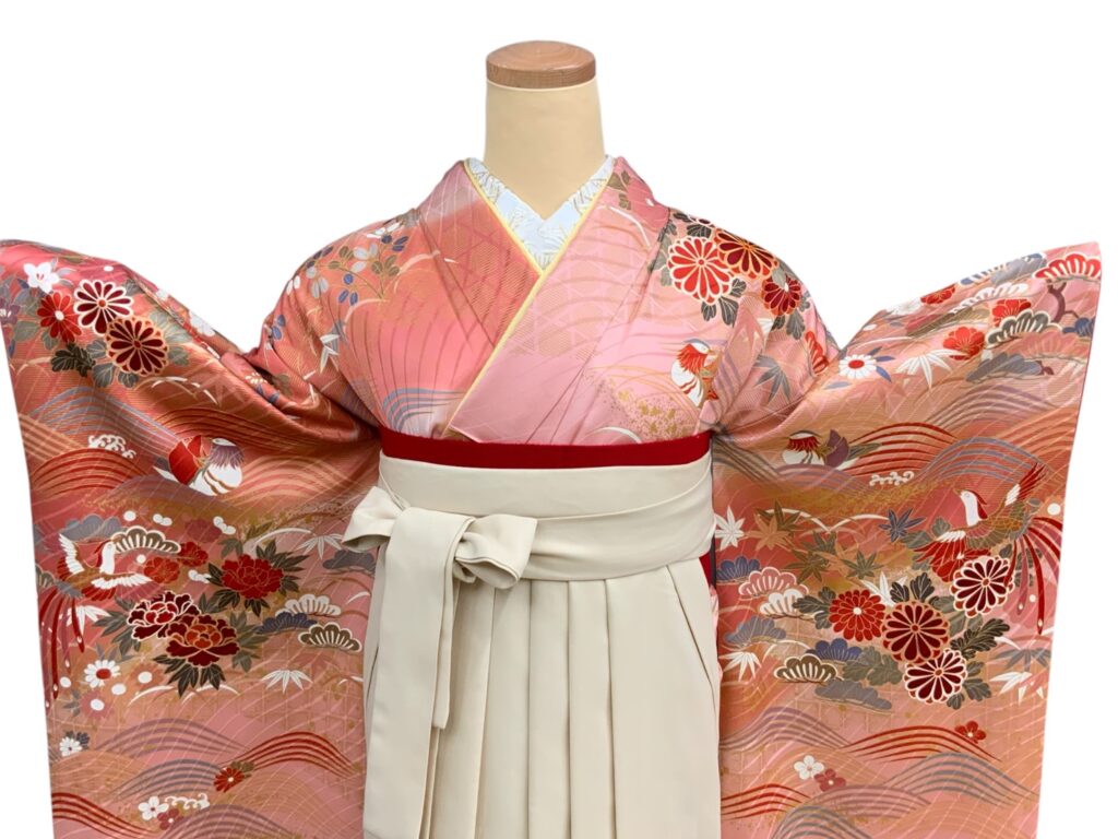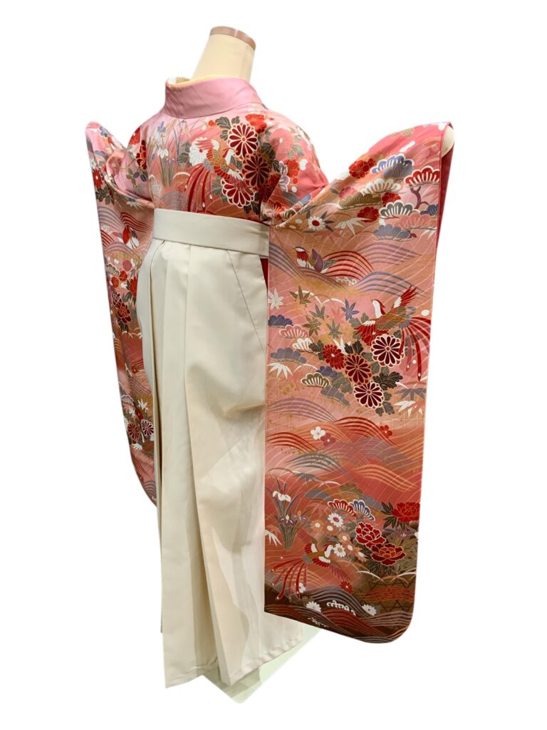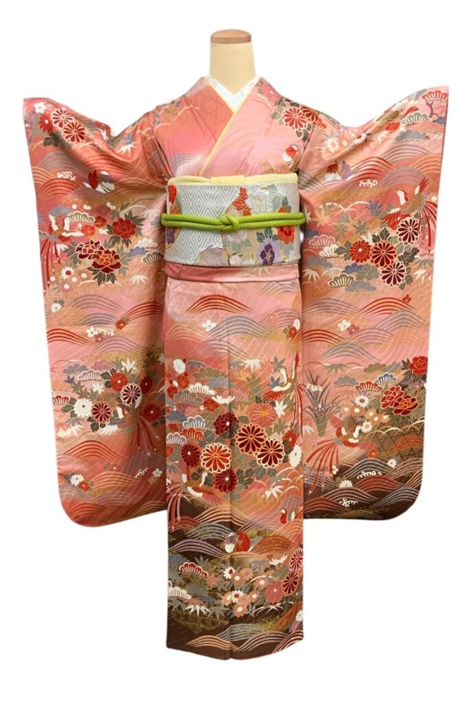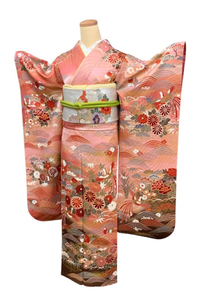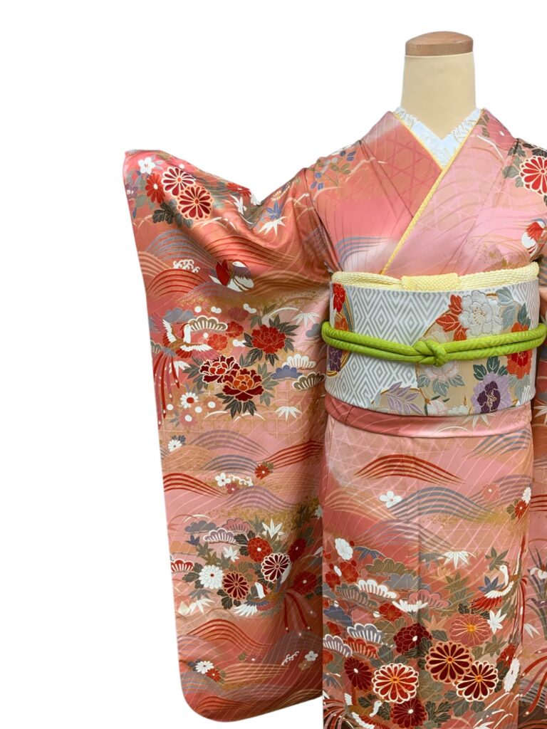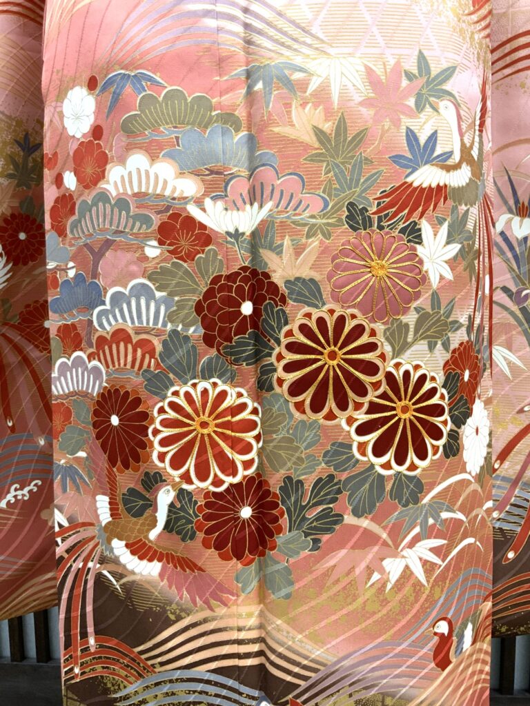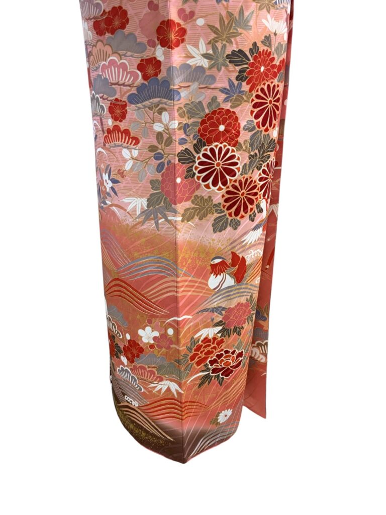 朱赤から柔らかな桃色へと続く華やかな地色に、 吉祥の波文様と四季折々の花々が贅沢に描かれた振袖です。 牡丹や菊などの花々が咲き誇り、 瑞鳥の姿もあしらわれ、晴れの日を華やかに彩ります。 色彩豊かでありながら上品さを失わず、 成人式や結婚式参列など、 人生の節目を華麗に演出してくれる一枚です。