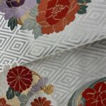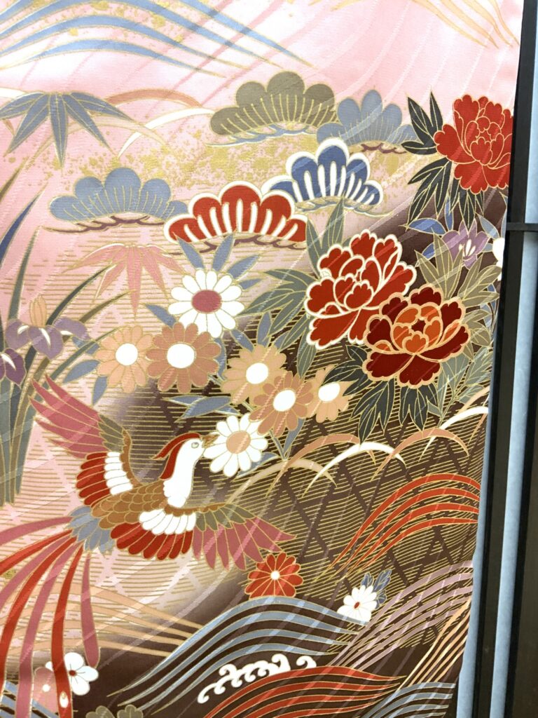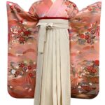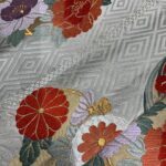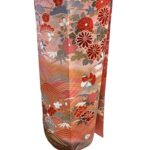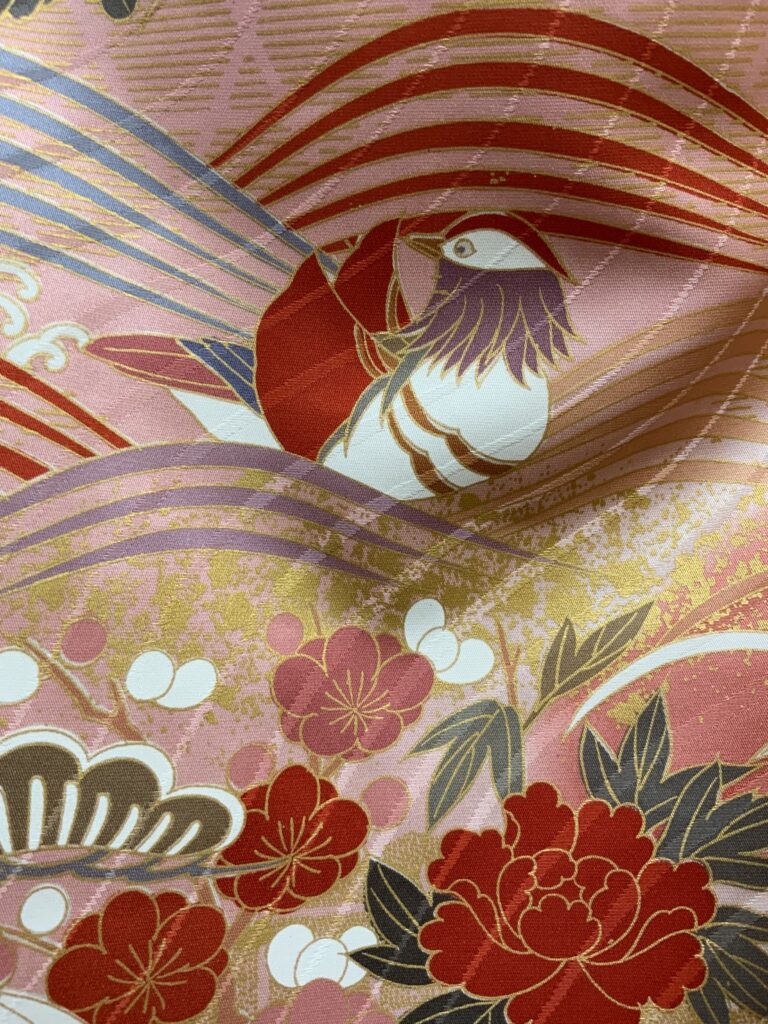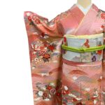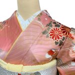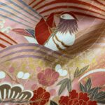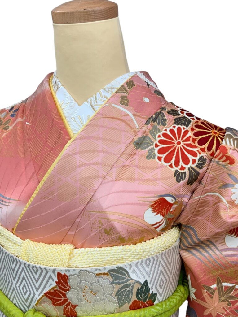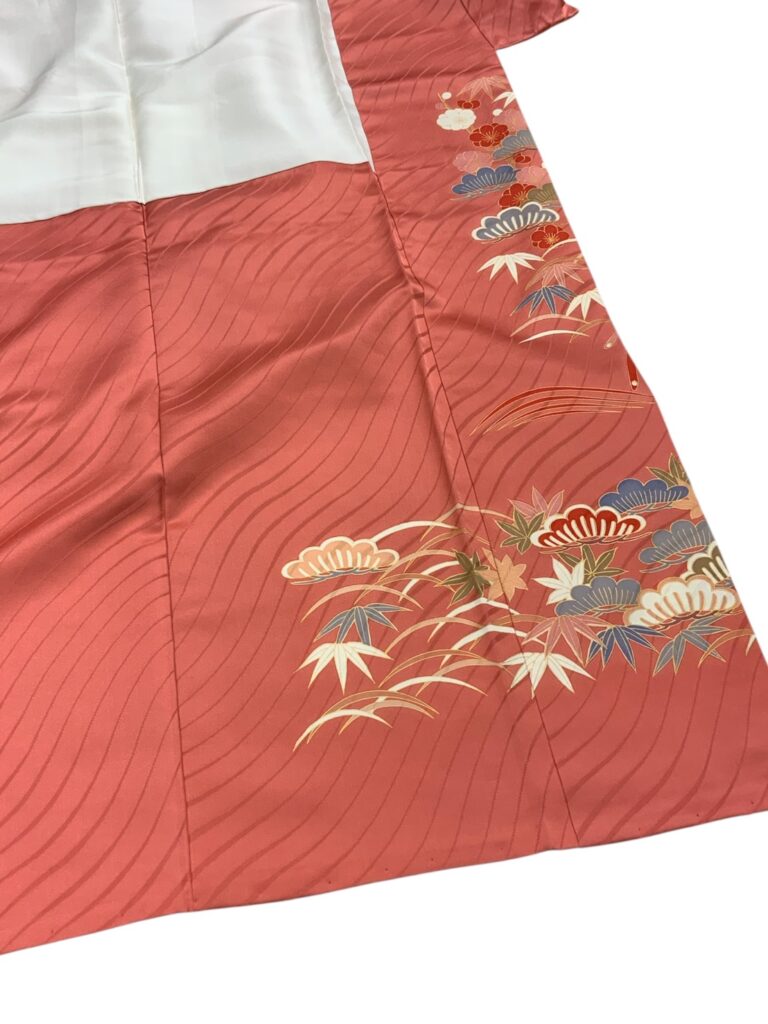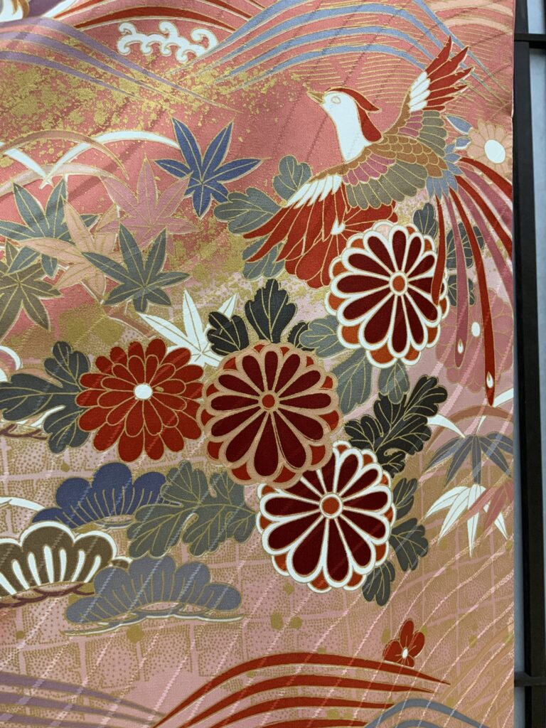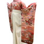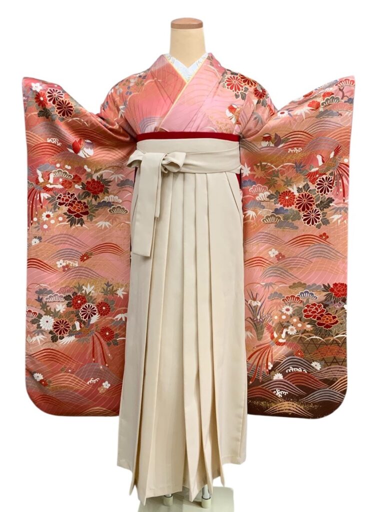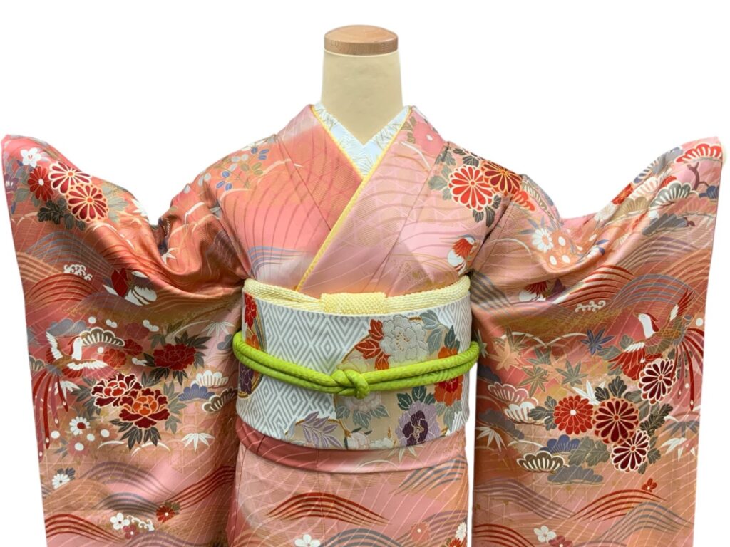 朱赤から柔らかな桃色へと続く華やかな地色に、 吉祥の波文様と四季折々の花々が贅沢に描かれた振袖です。 牡丹や菊などの花々が咲き誇り、 瑞鳥の姿もあしらわれ、晴れの日を華やかに彩ります。 色彩豊かでありながら上品さを失わず、 成人式や結婚式参列など、 人生の節目を華麗に演出してくれる一枚です。