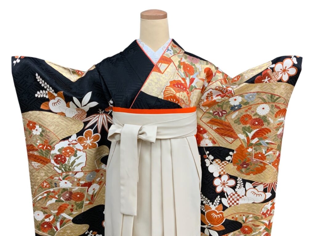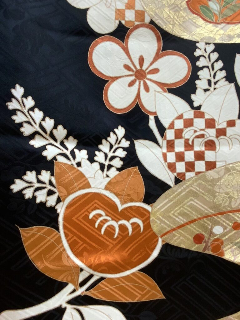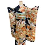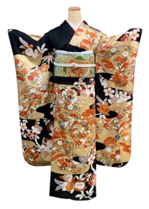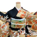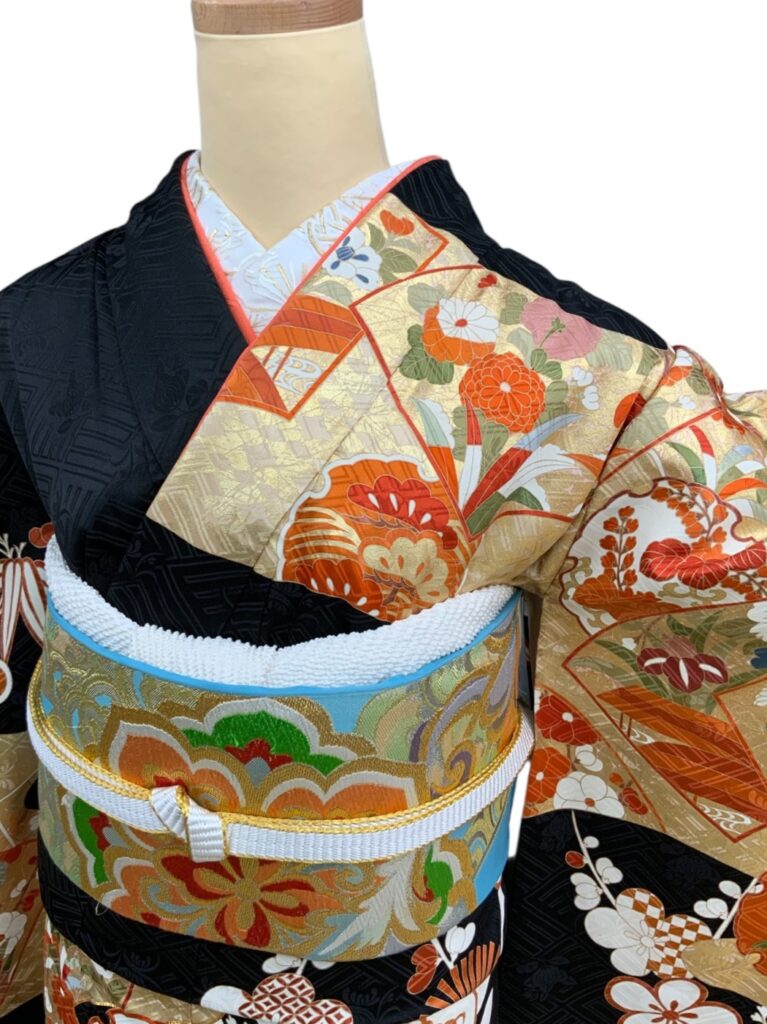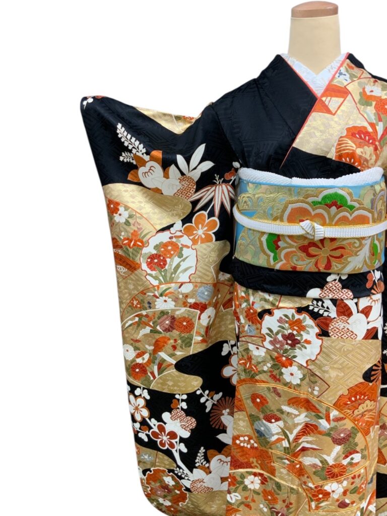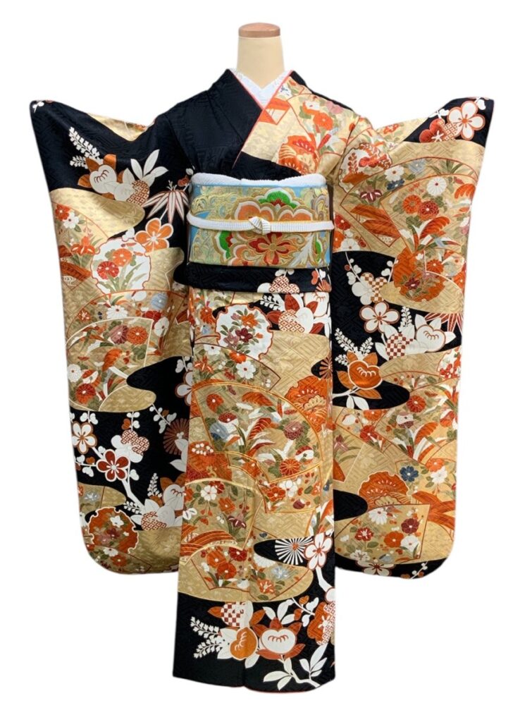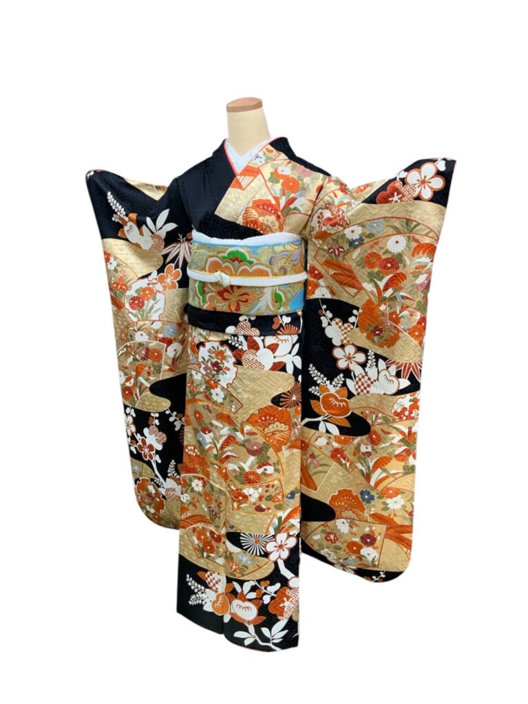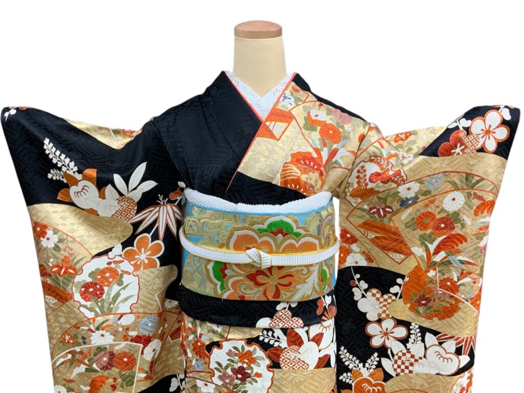 黒地に金彩を贅沢にあしらった、 格調高い振袖です。 扇面や花々、吉祥文様が重なり合い、 友禅のお着物に、刺繍が華やかな立体感を添えています。 光の角度で輝きを変える金彩と、 緻密な刺繍の調和は晴れの日にふさわしい豪華さ。 成人式や披露宴など、一生の思い出を彩るに相応しい逸品です。