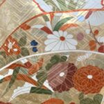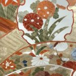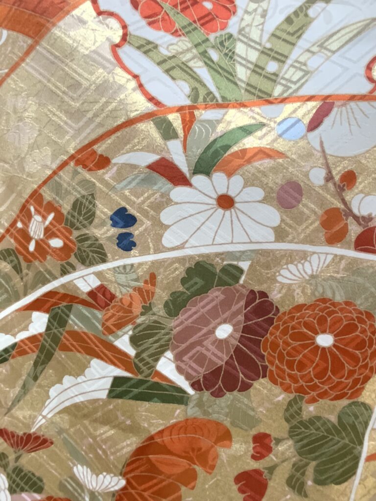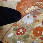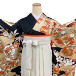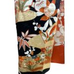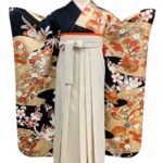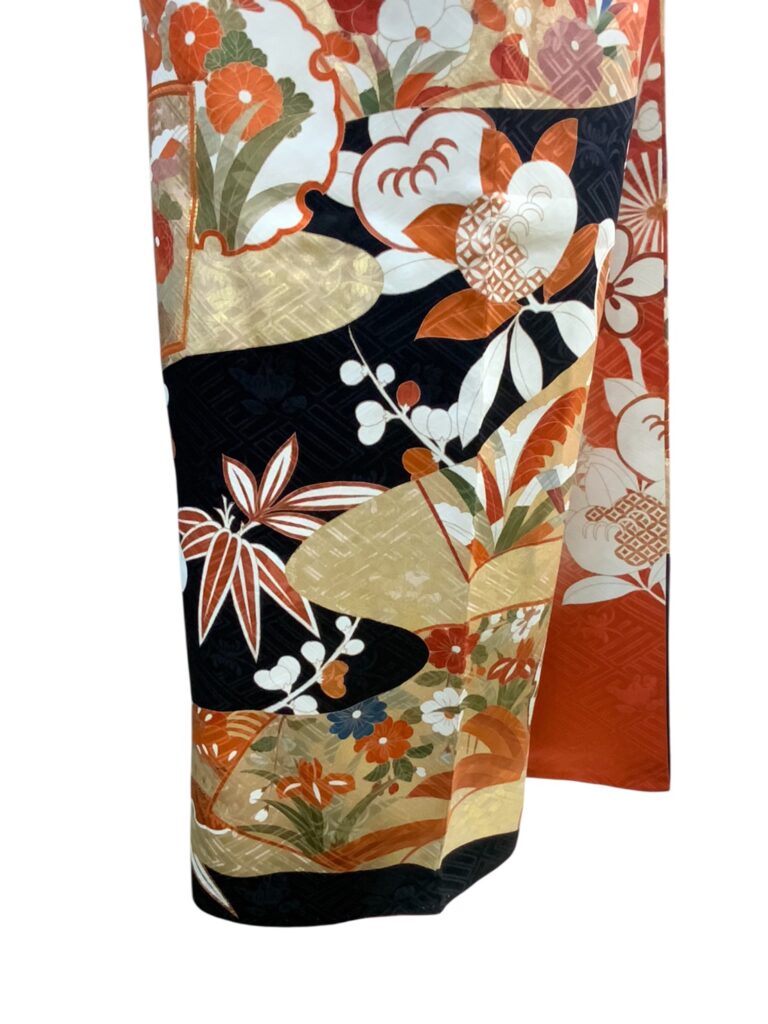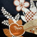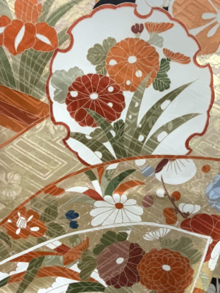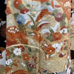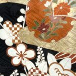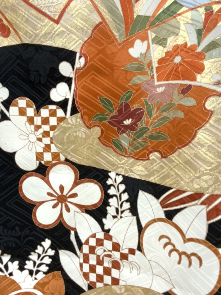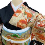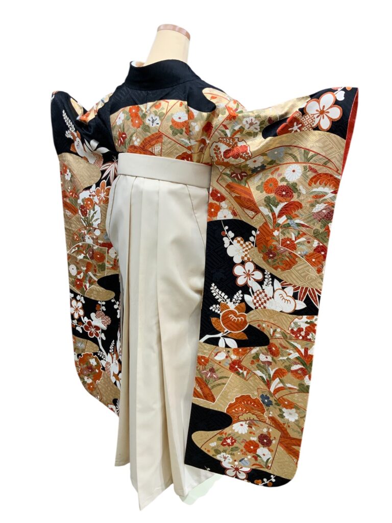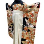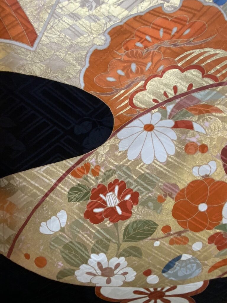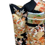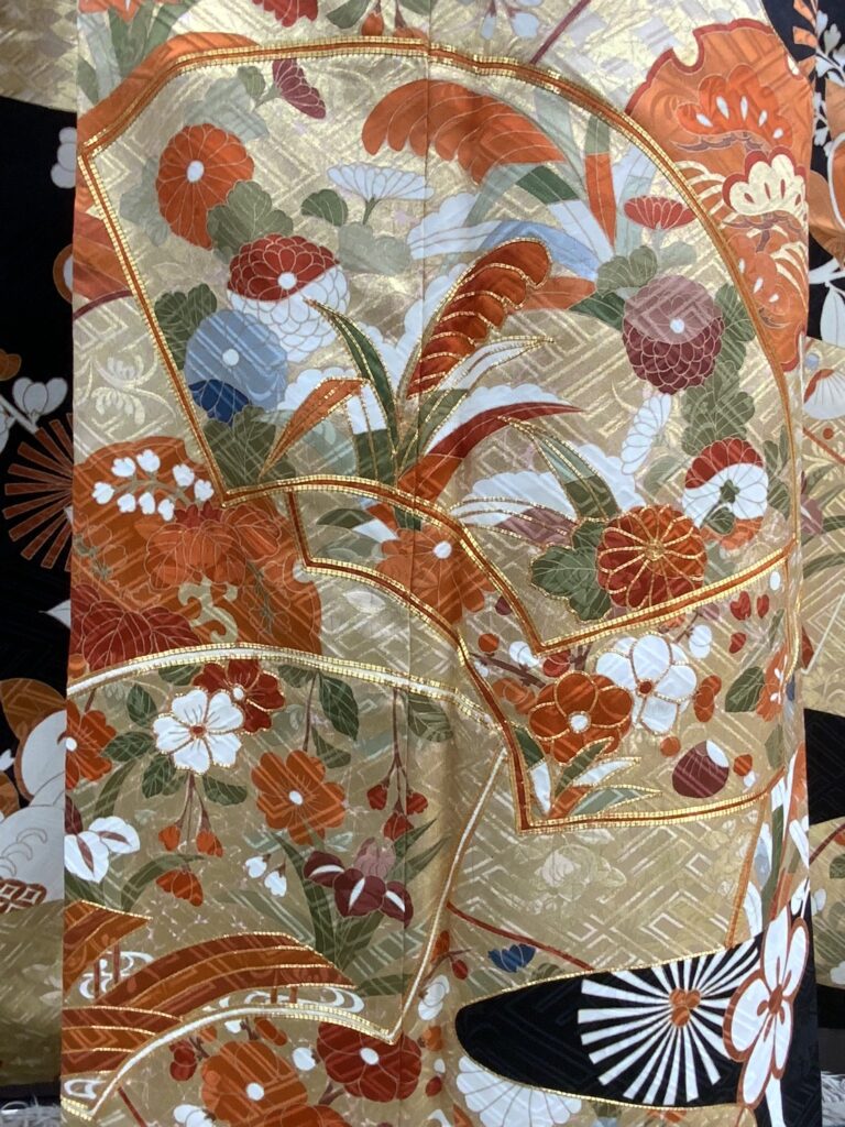 黒地に金彩を贅沢にあしらった、 格調高い振袖です。 扇面や花々、吉祥文様が重なり合い、 友禅のお着物に、刺繍が華やかな立体感を添えています。 光の角度で輝きを変える金彩と、 緻密な刺繍の調和は晴れの日にふさわしい豪華さ。 成人式や披露宴など、一生の思い出を彩るに相応しい逸品です。