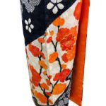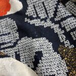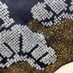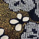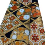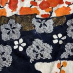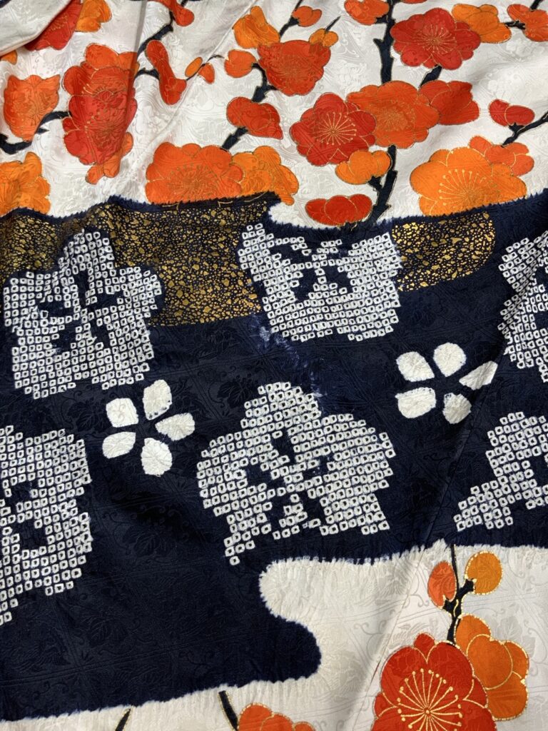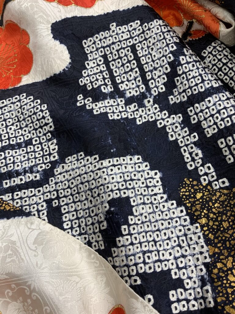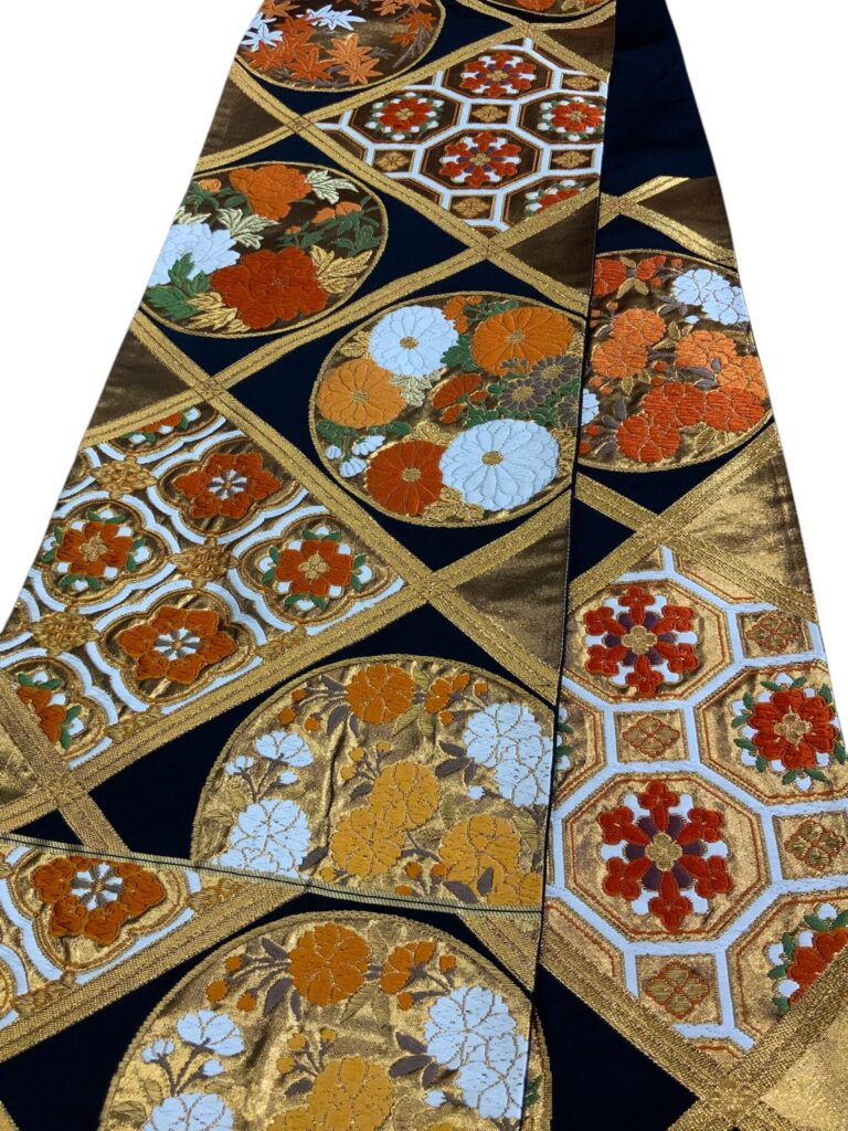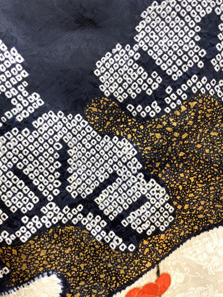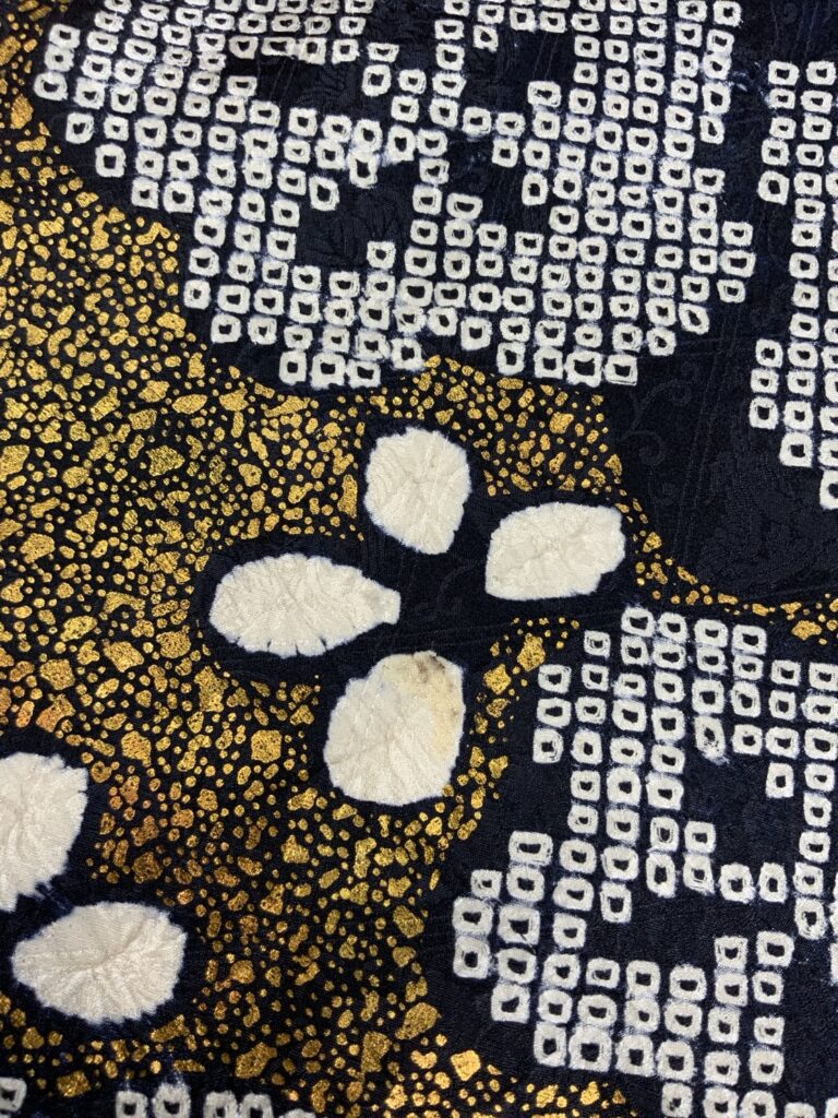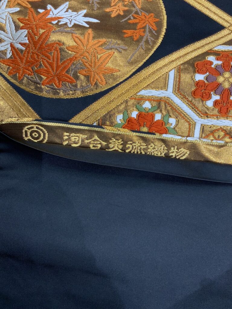 深い藍地の部分には雪輪や花唐草が織り込まれ、