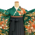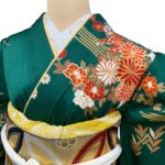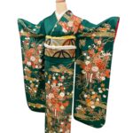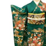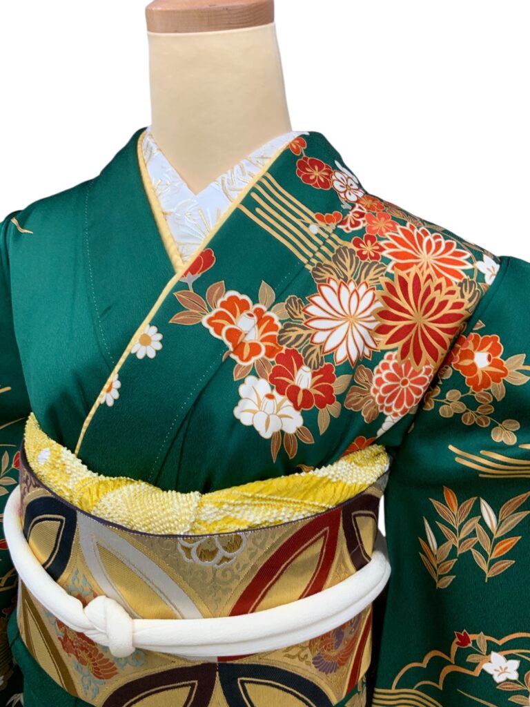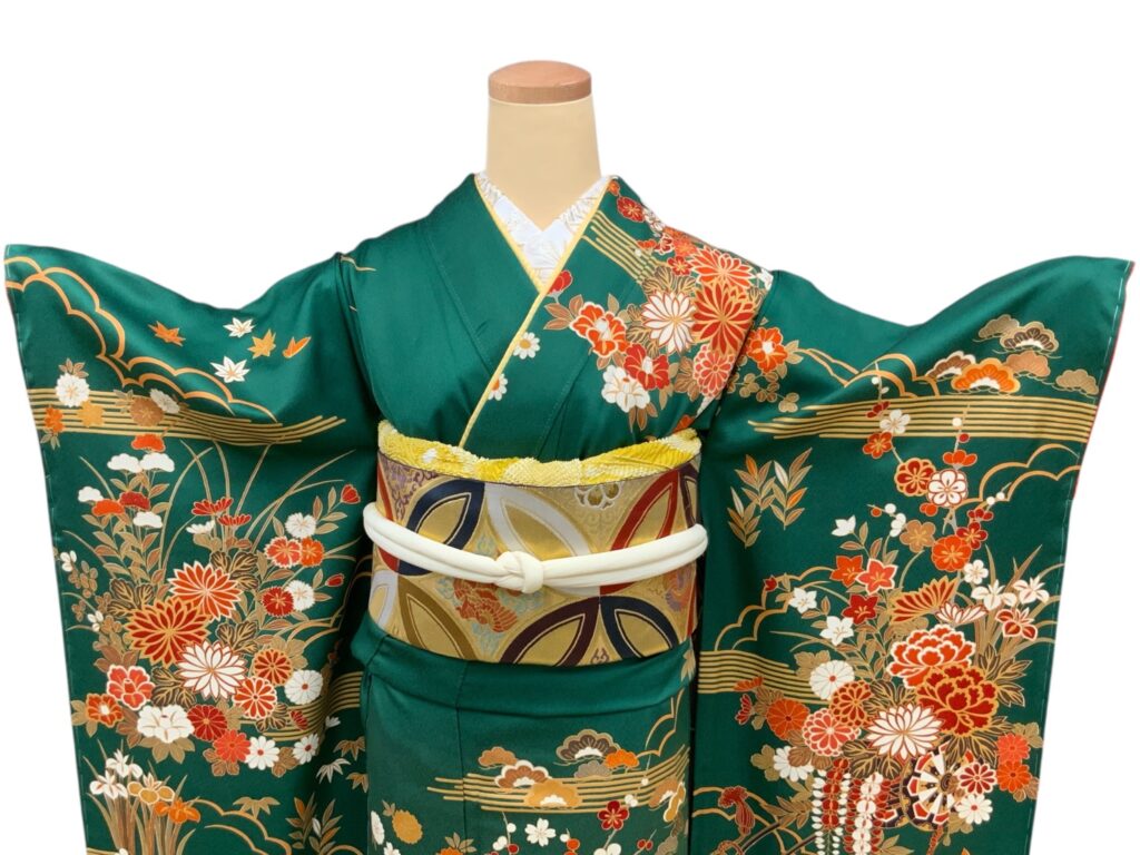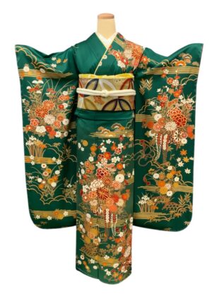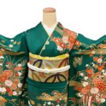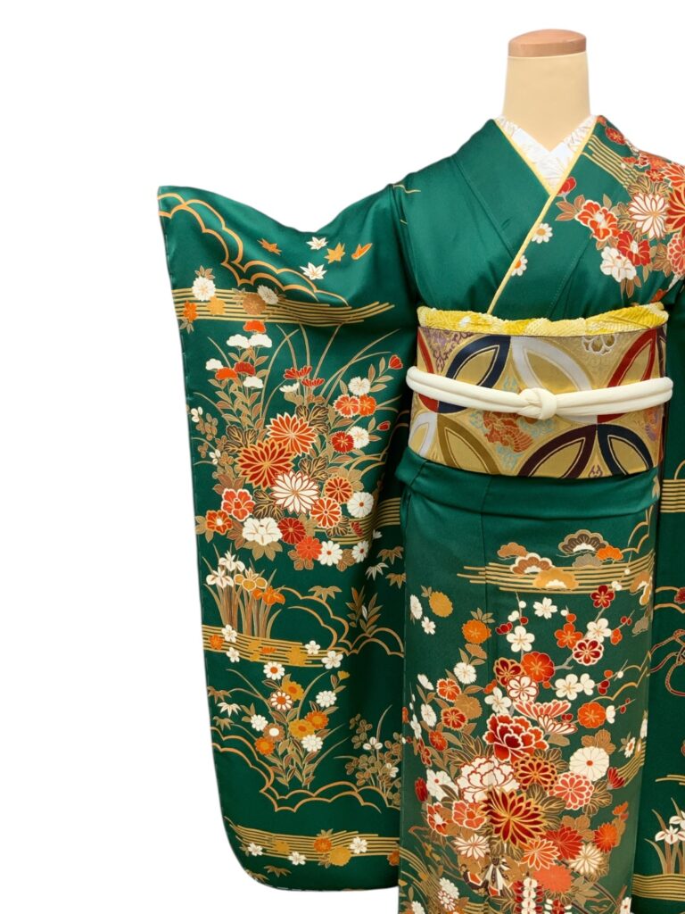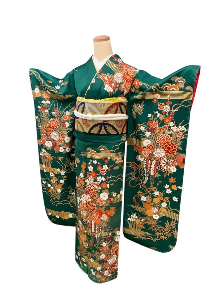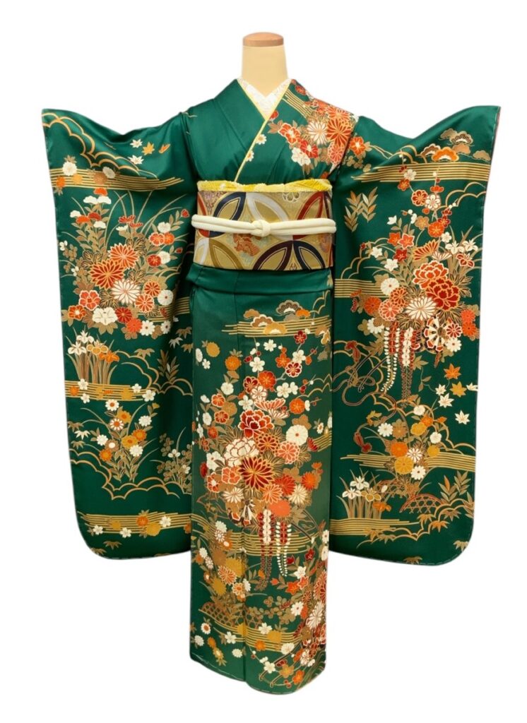 深みのある緑地に、 豪華な四季花が咲き誇る格調高い振袖です。 菊や牡丹、梅などの吉祥文様が金彩と共に施され、 晴れの日にふさわしい華やかさと気品を感じさせます。 帯合わせ次第で古典的にもモダンにも表情を変えられる一枚。 成人式・結婚式列席など特別な場面に最適です。