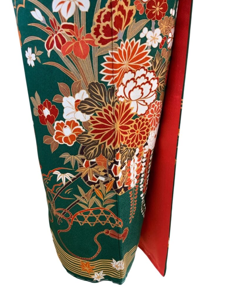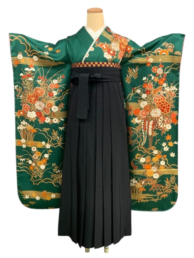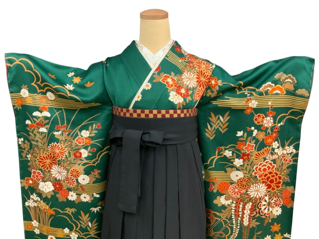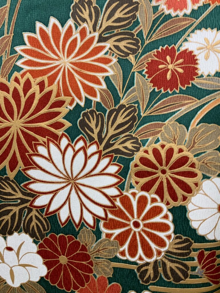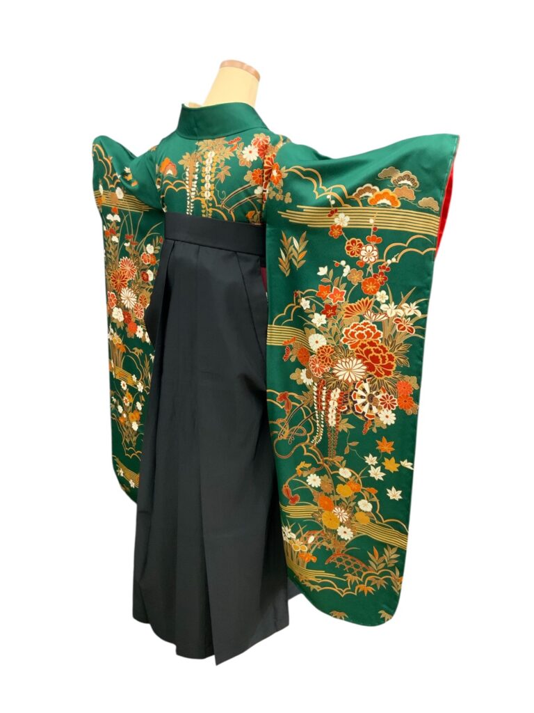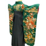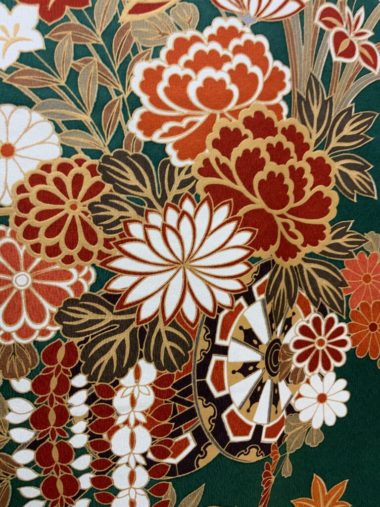 深みのある緑地に、 豪華な四季花が咲き誇る格調高い振袖です。 菊や牡丹、梅などの吉祥文様が金彩と共に施され、 晴れの日にふさわしい華やかさと気品を感じさせます。 帯合わせ次第で古典的にもモダンにも表情を変えられる一枚。 成人式・結婚式列席など特別な場面に最適です。