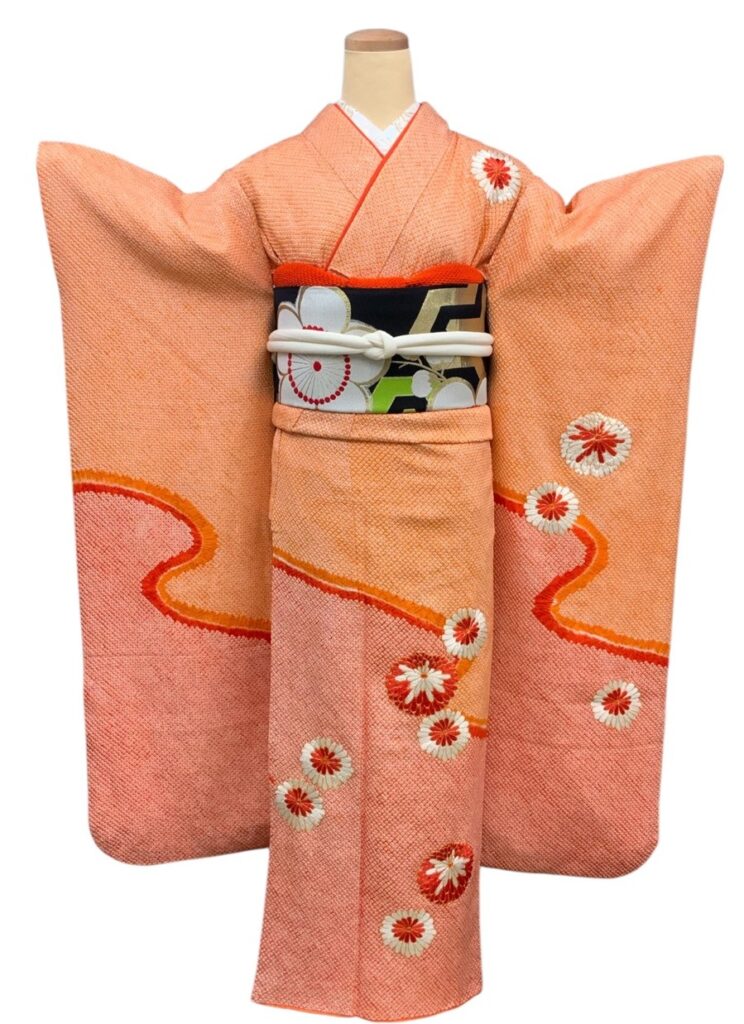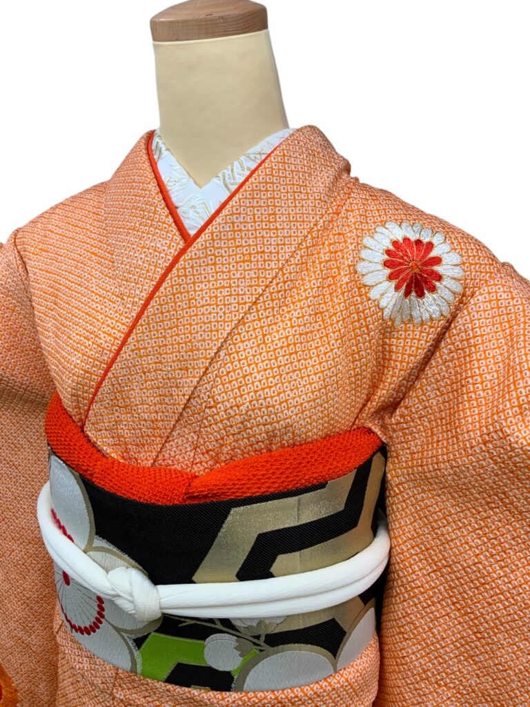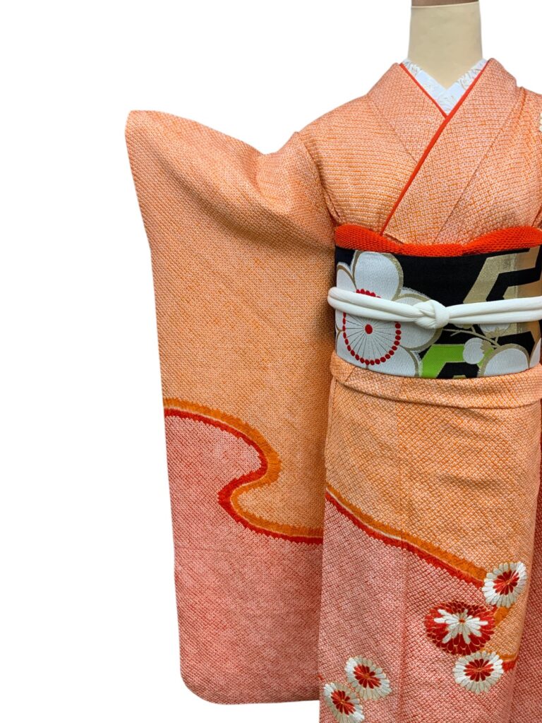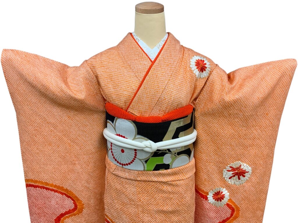 伝統の総絞り地に、 菊花文様を立体的に刺繍であしらった、 豪華な振袖です。細やかな絞りが織りなす柔らかな質感と、 手仕事ならではの凹凸が光を受けて表情を変え、 晴れの日にふさわしい気品を放ちます。 菊花の刺繍は紅白の配色に金糸を添え、 華やかさと清楚さを兼ね備えた意匠。 吉祥文様である菊は長寿や繁栄を象徴し、 成人式・結婚式列席・晴れやかな舞台に最適です。 やわらかな橙から桃色へのグラデーションが優美で、 立ち姿をより引き立てます。 古典の重厚さと可憐さを兼ね備えた逸品です。