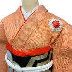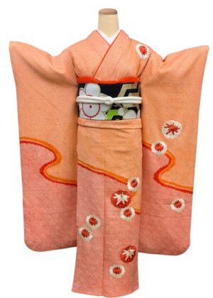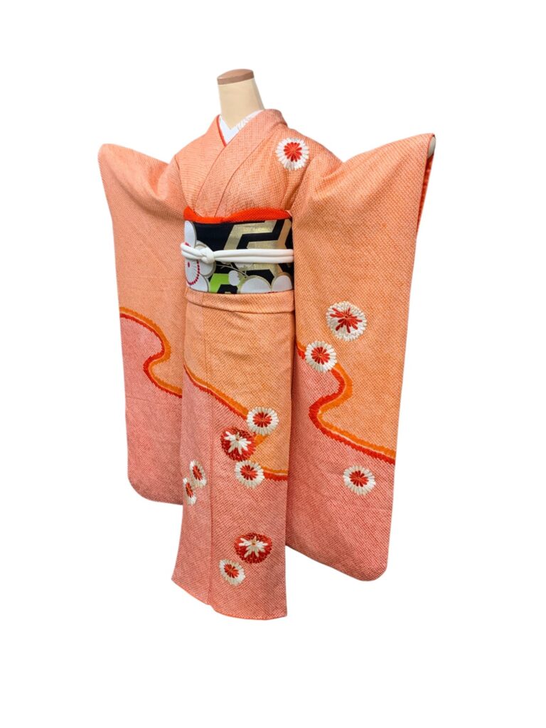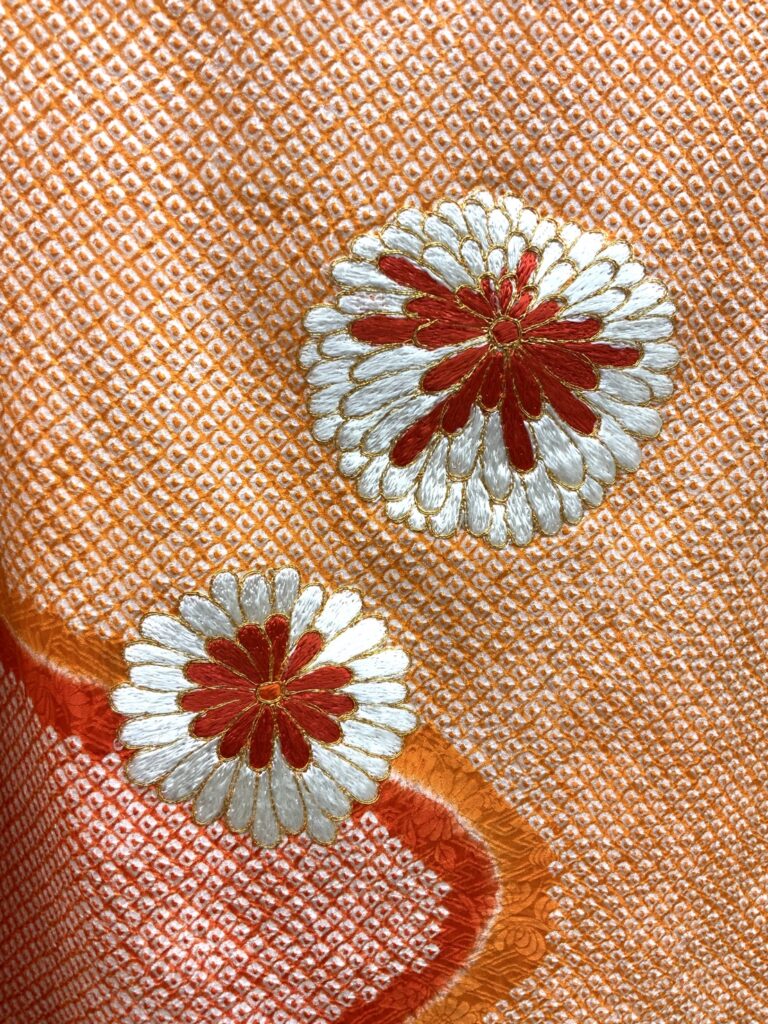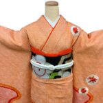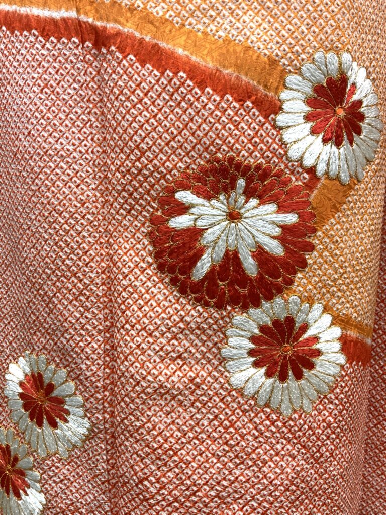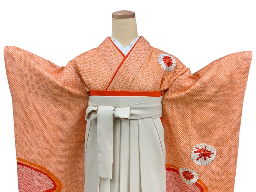 伝統の総絞り地に、 菊花文様を立体的に刺繍であしらった、 豪華な振袖です。細やかな絞りが織りなす柔らかな質感と、 手仕事ならではの凹凸が光を受けて表情を変え、 晴れの日にふさわしい気品を放ちます。 菊花の刺繍は紅白の配色に金糸を添え、 華やかさと清楚さを兼ね備えた意匠。 吉祥文様である菊は長寿や繁栄を象徴し、 成人式・結婚式列席・晴れやかな舞台に最適です。 やわらかな橙から桃色へのグラデーションが優美で、 立ち姿をより引き立てます。 古典の重厚さと可憐さを兼ね備えた逸品です。