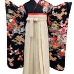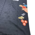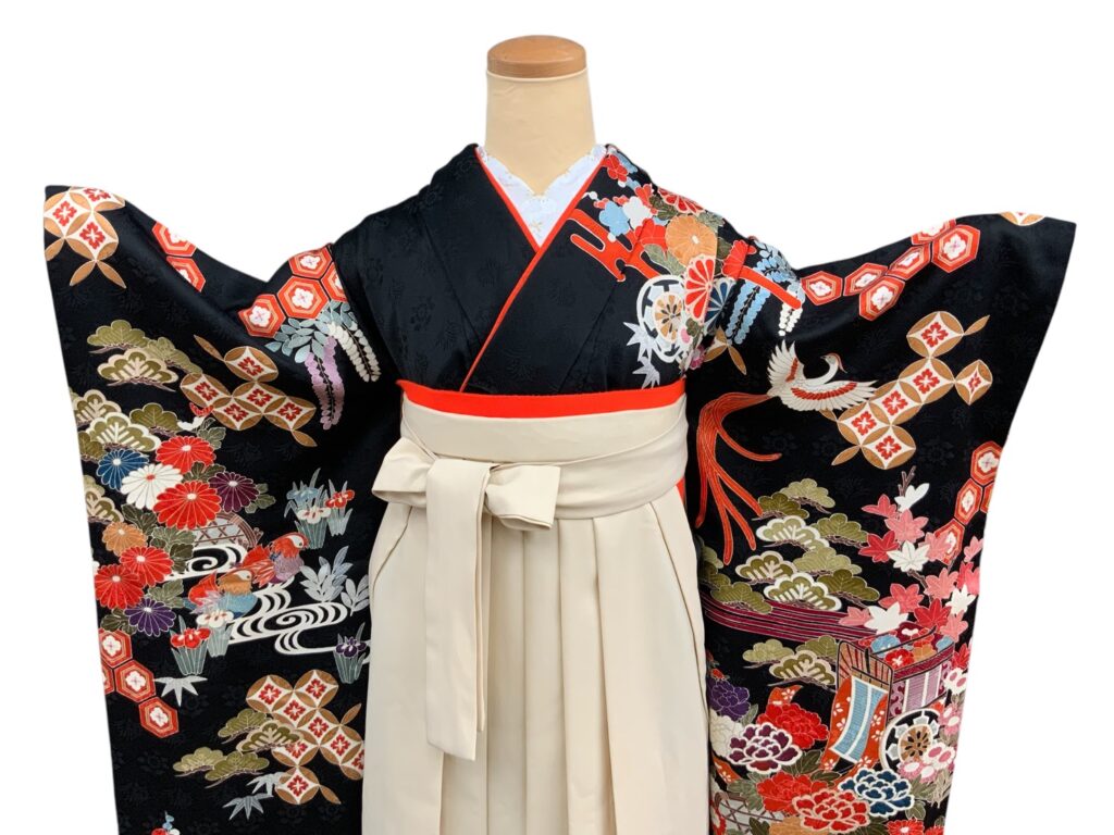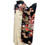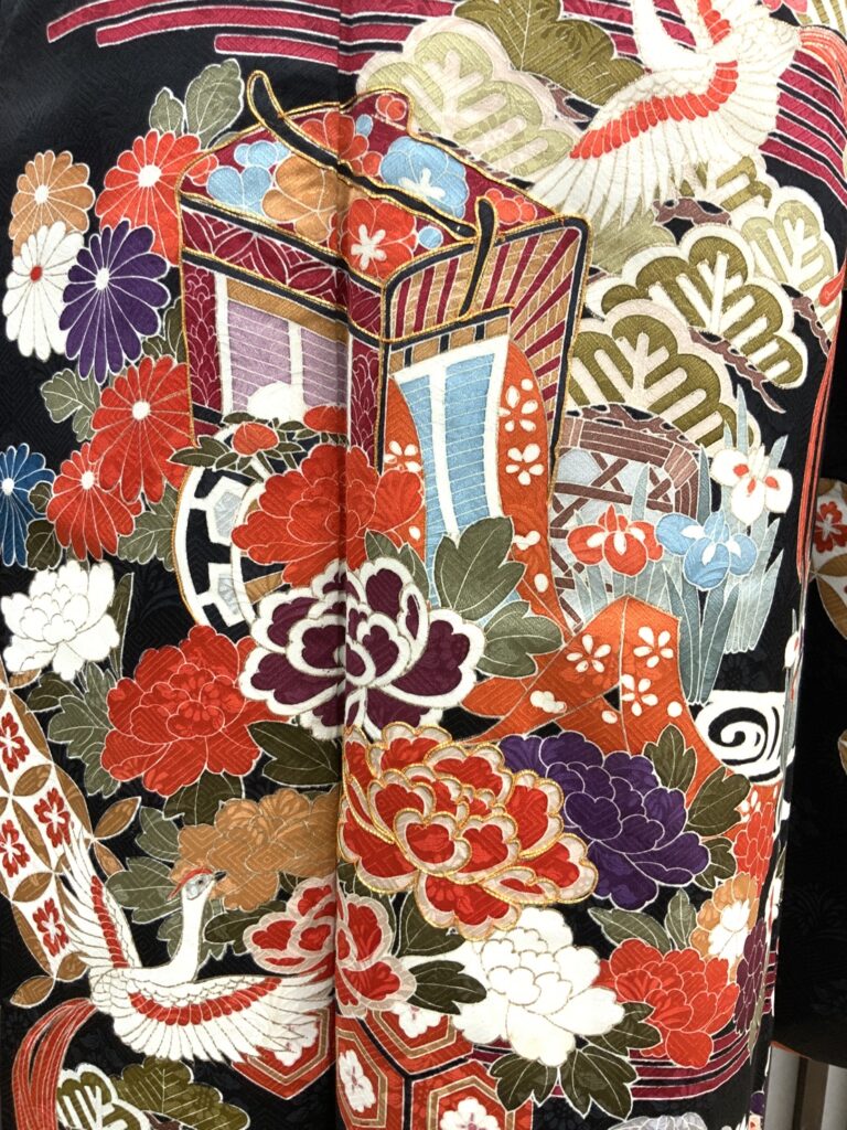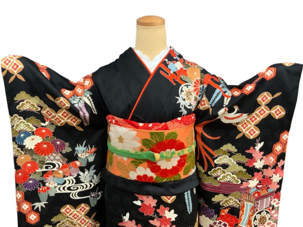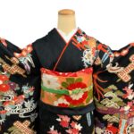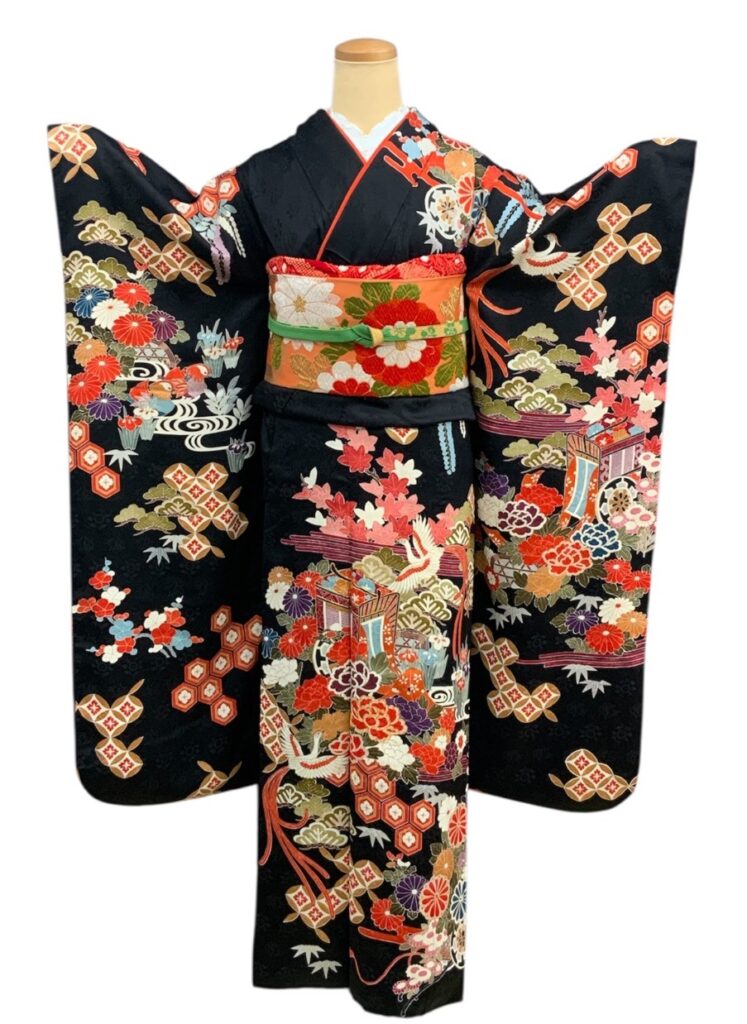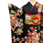 黒地ならではの引き締まった美しさの中に、朱赤・白・藍・金彩の配色が映え、晴れの日にふさわしい存在感を放つ一枚。