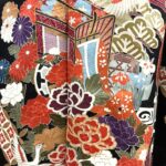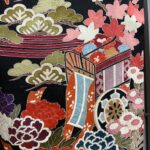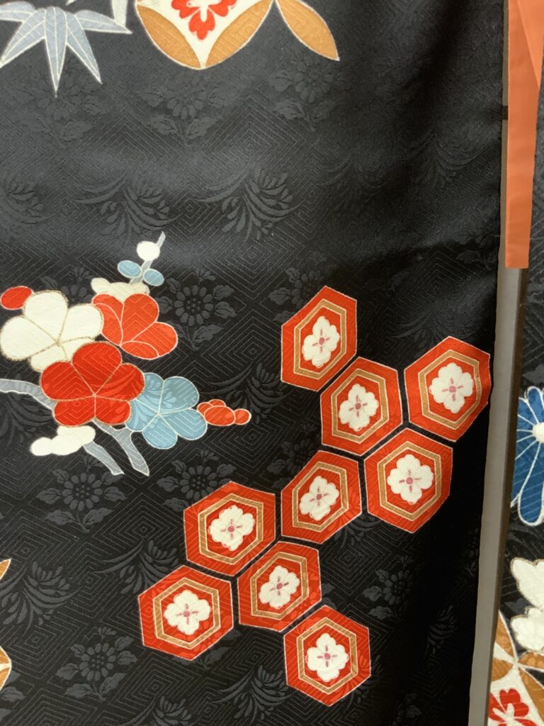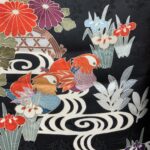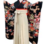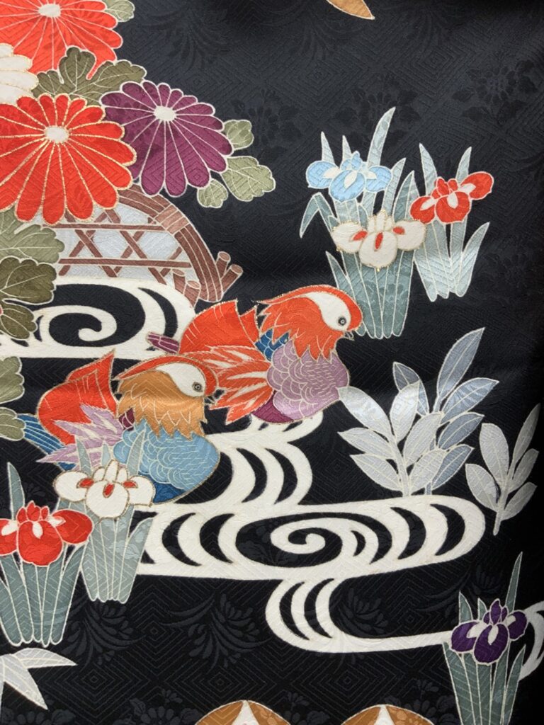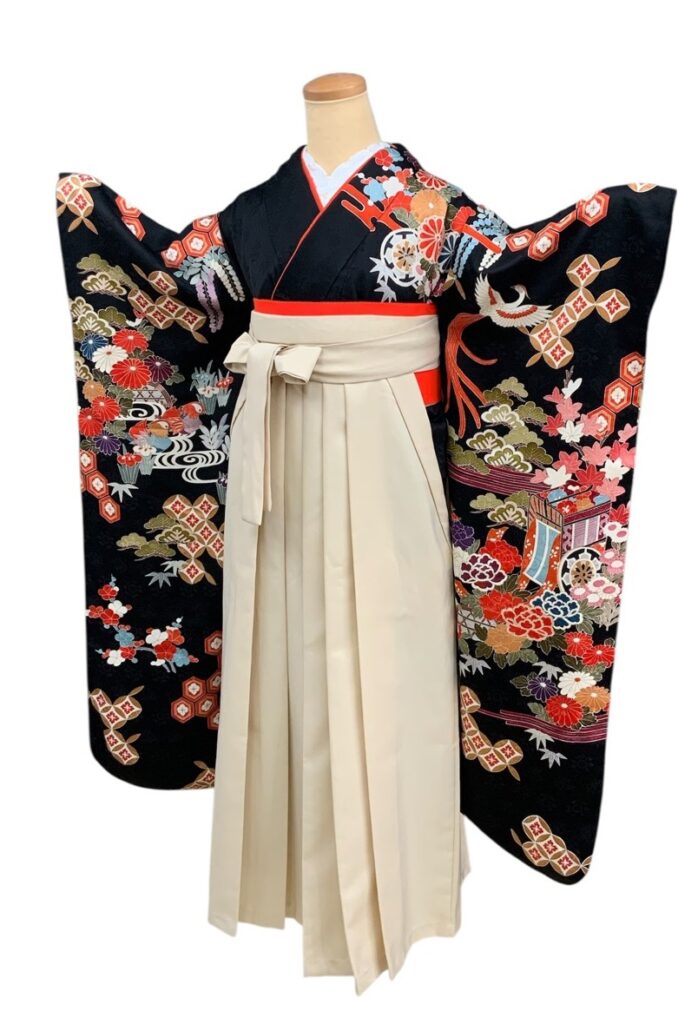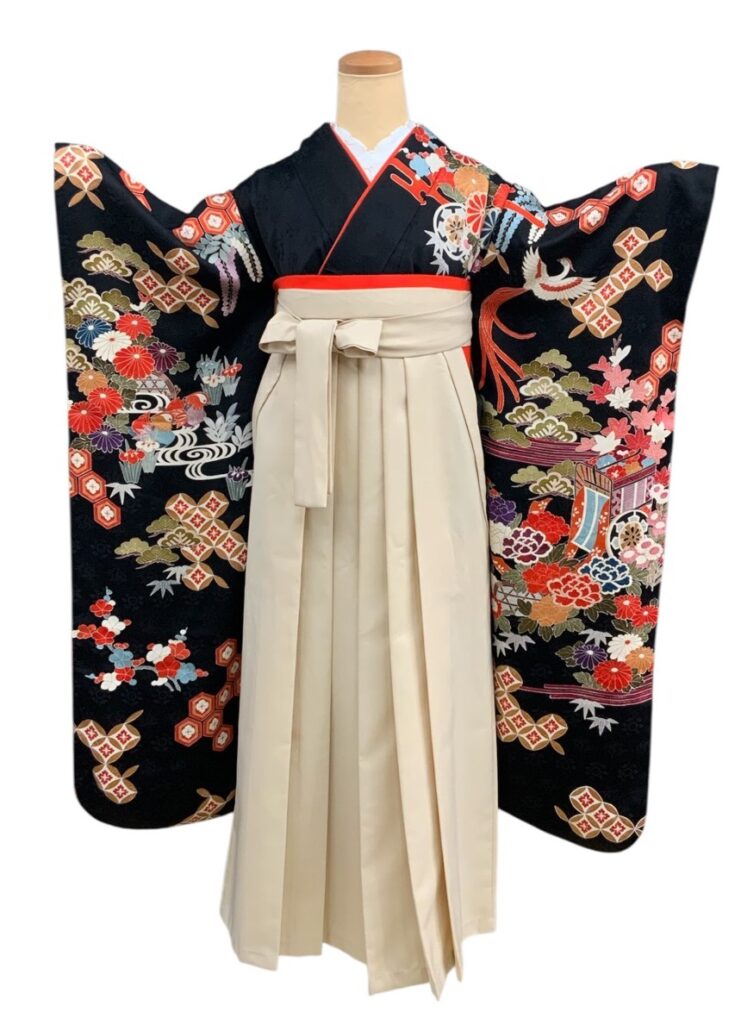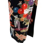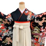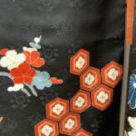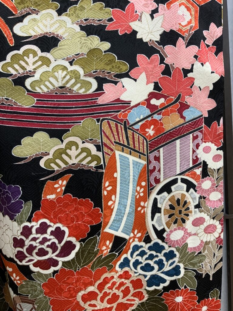 黒地ならではの引き締まった美しさの中に、朱赤・白・藍・金彩の配色が映え、晴れの日にふさわしい存在感を放つ一枚。