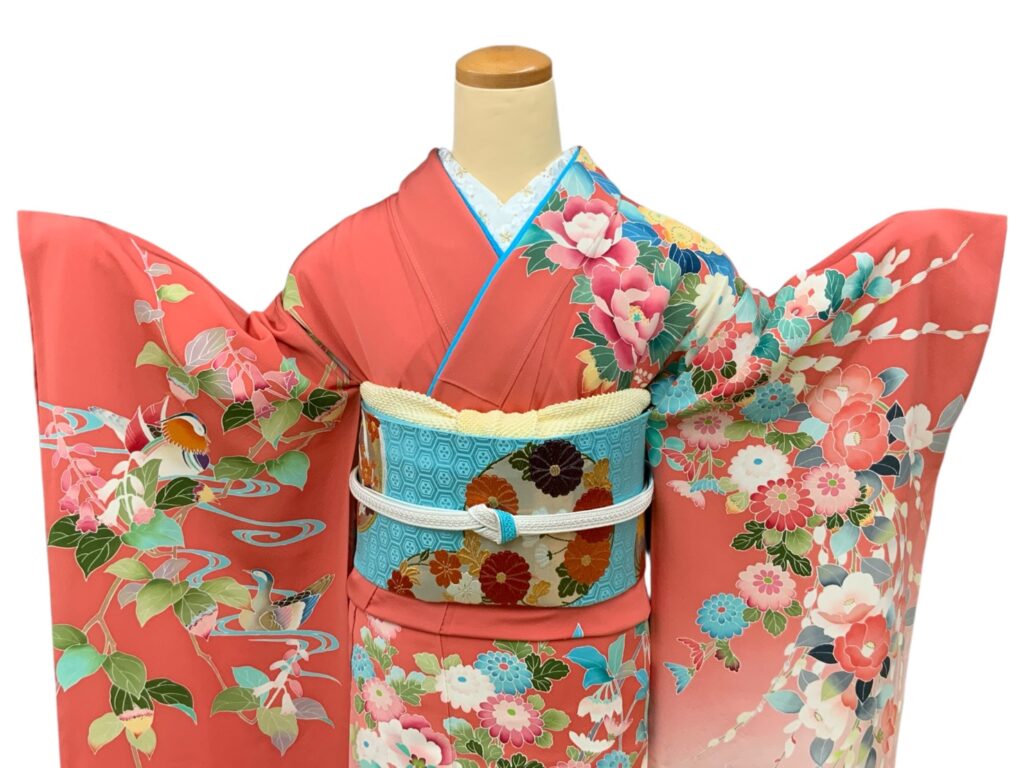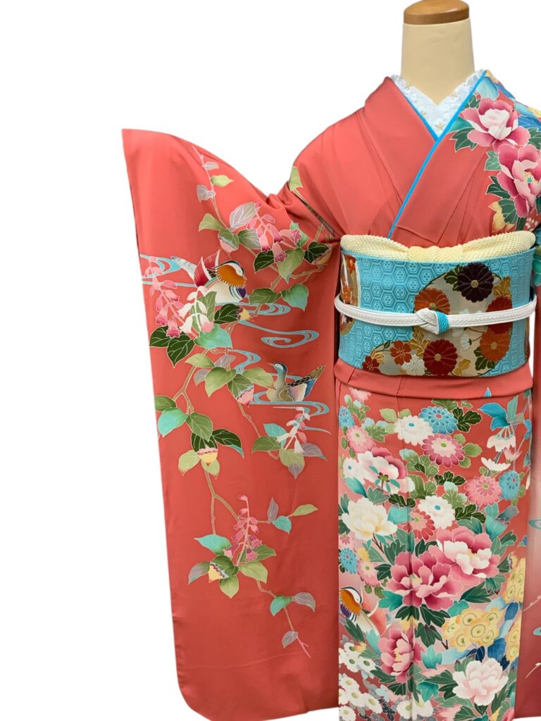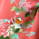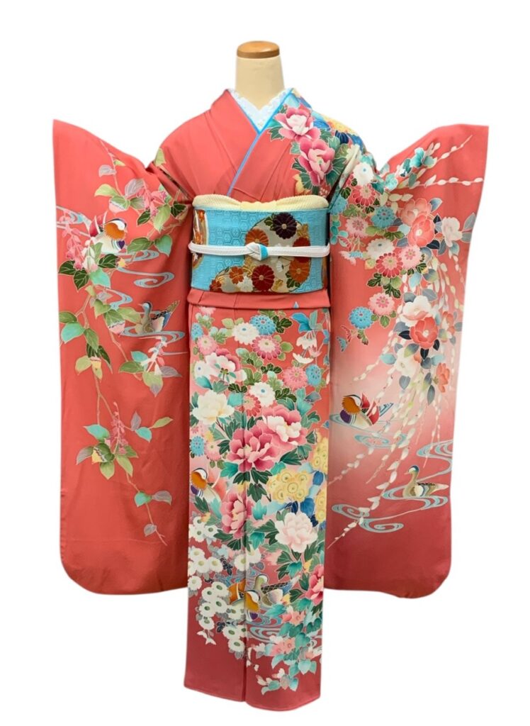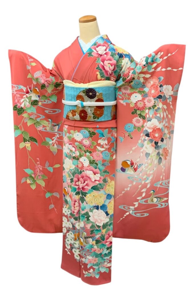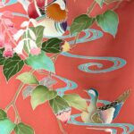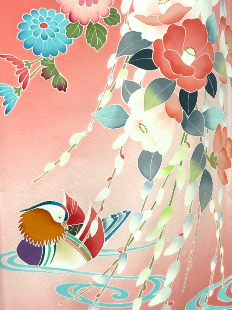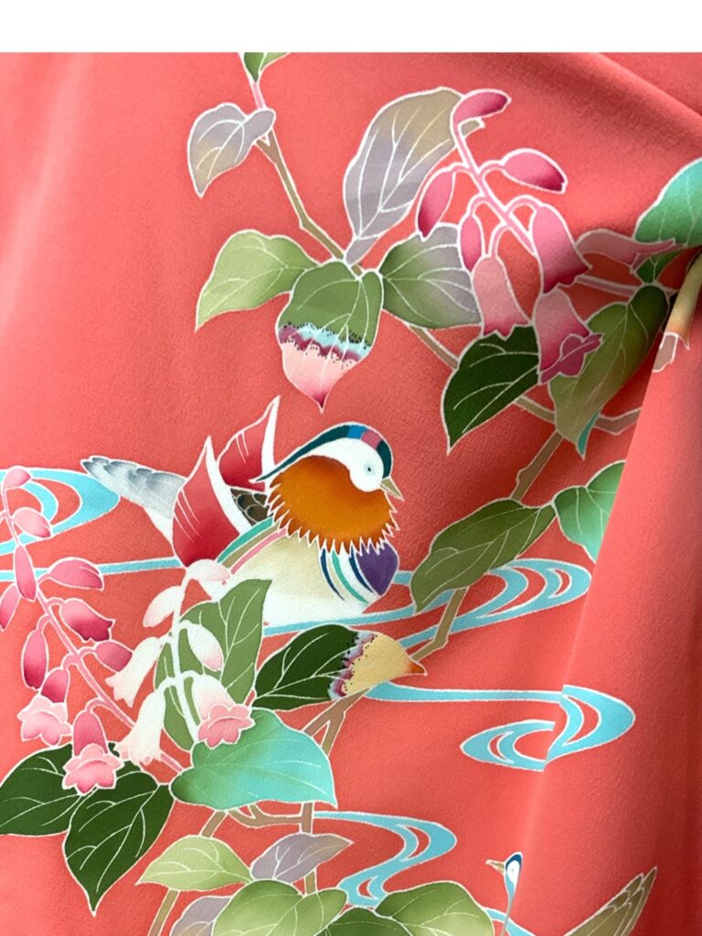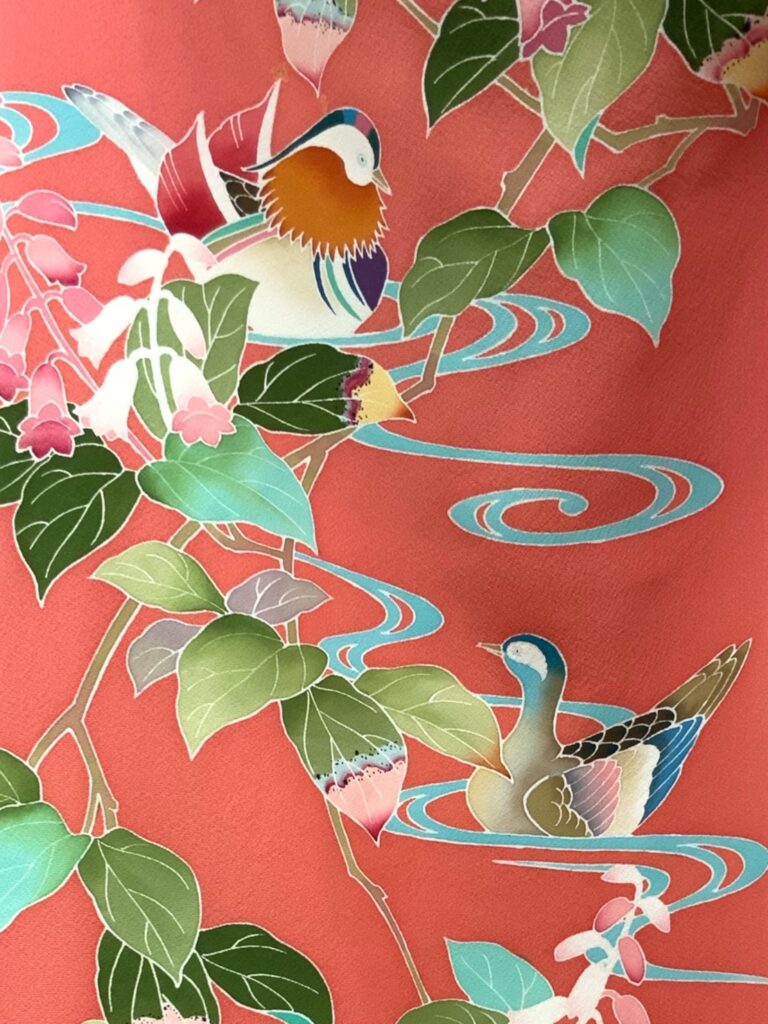 珊瑚色に染め上げた上品な地色に、優雅に流れる水紋と吉祥の鴛鴦(おしどり)。