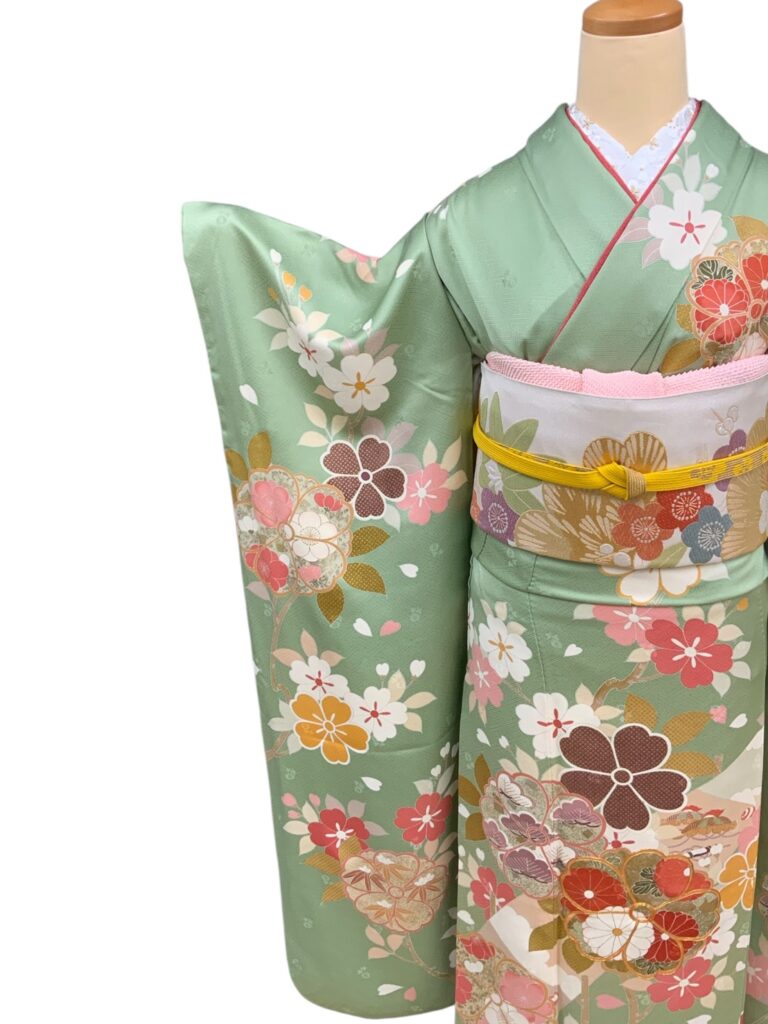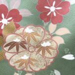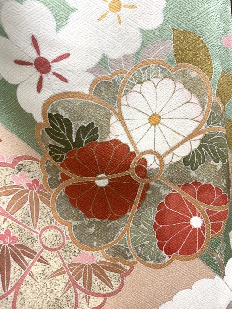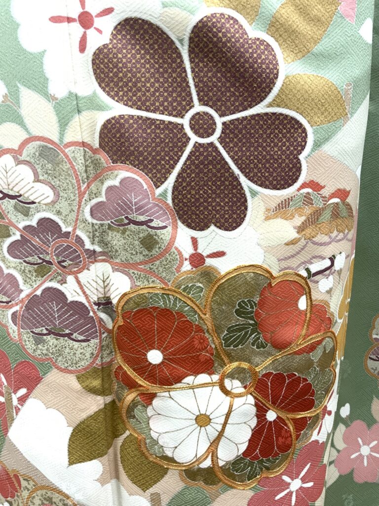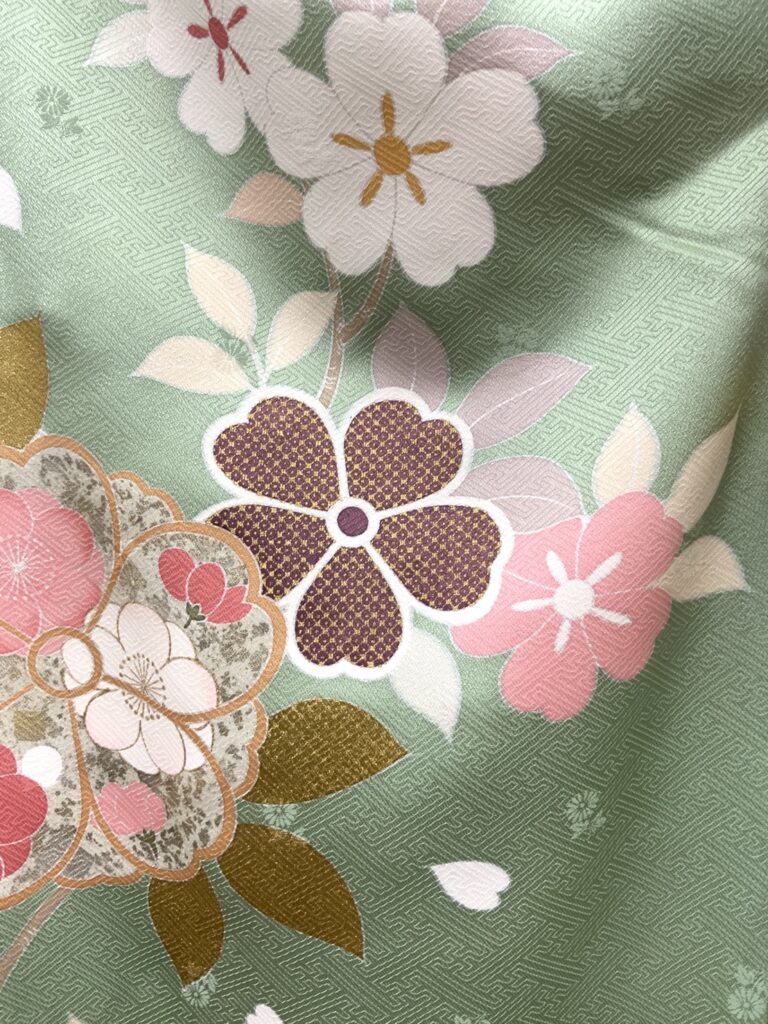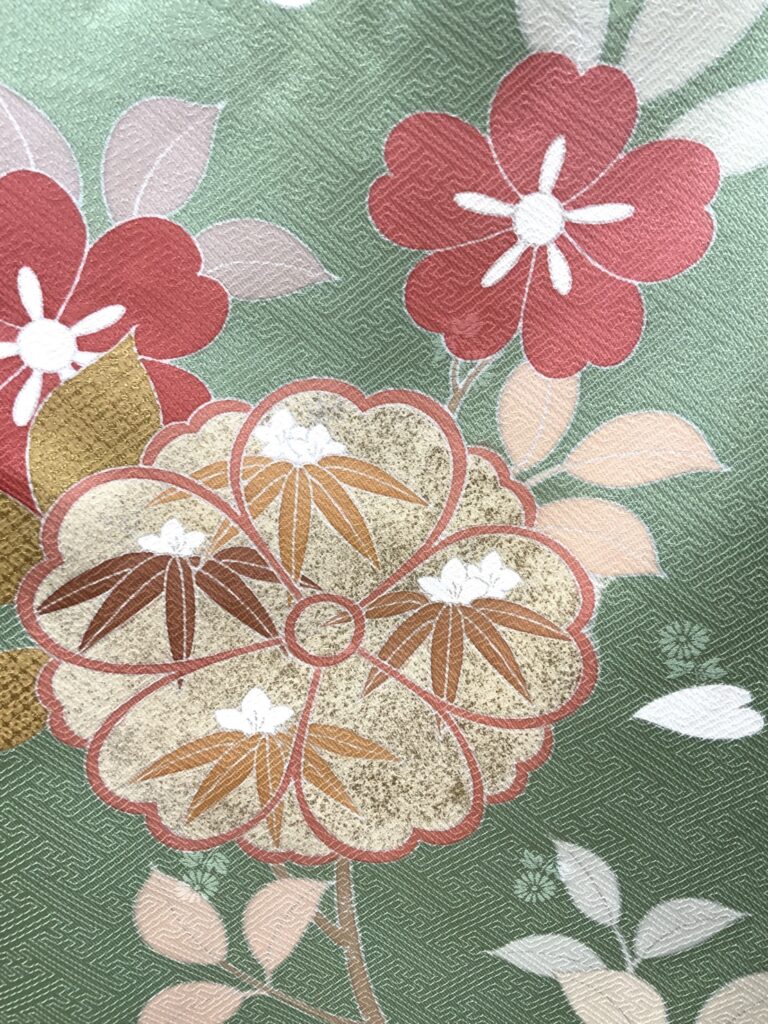 やわらかな若草色の地に、四季の花々が優しく咲き誇る一枚。