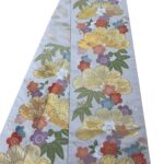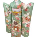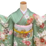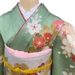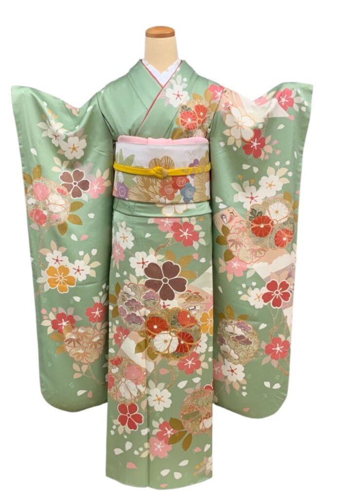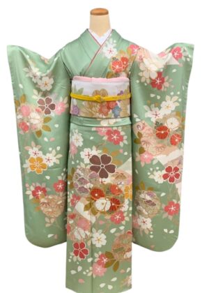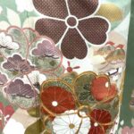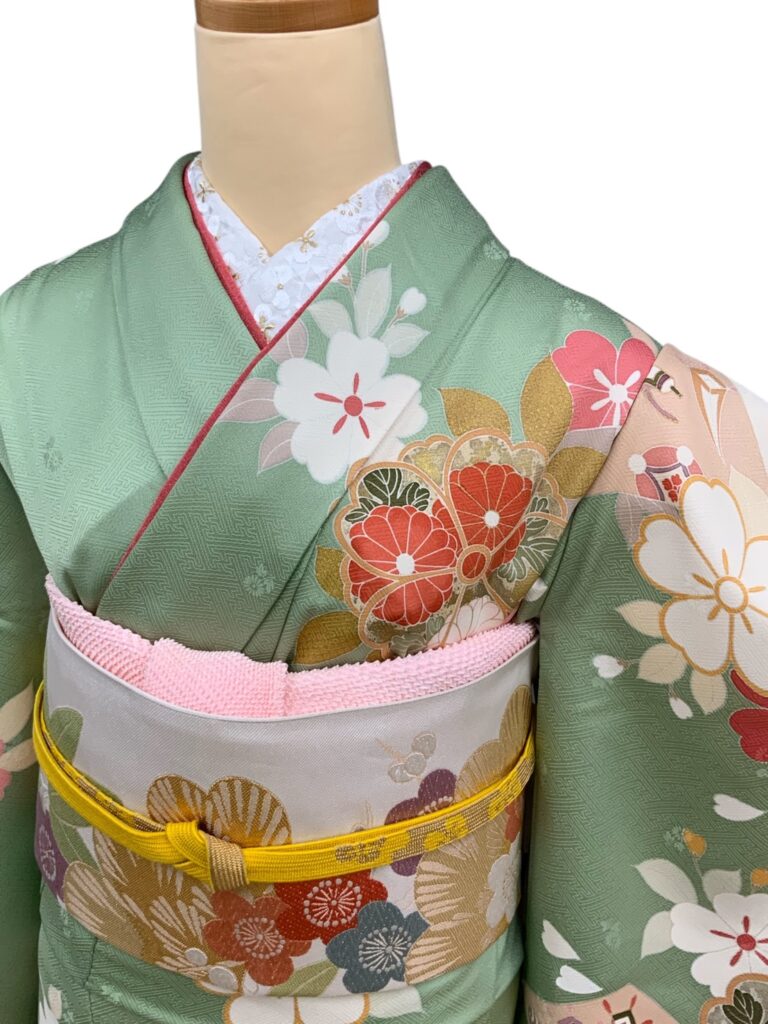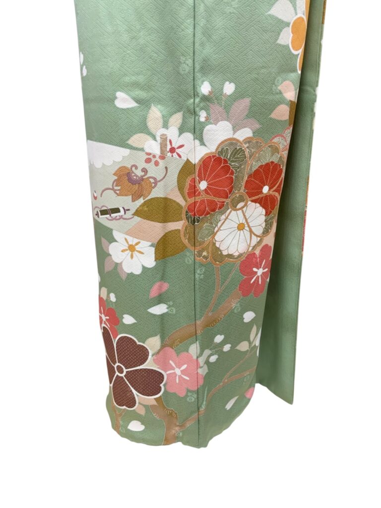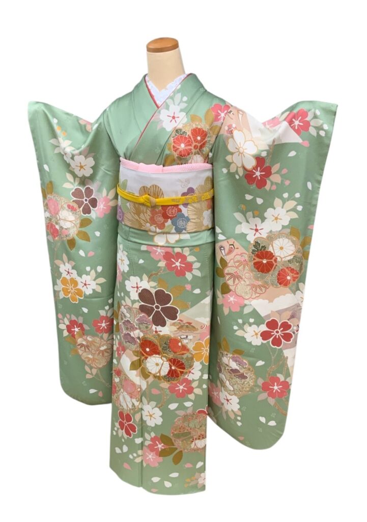 やわらかな若草色の地に、四季の花々が優しく咲き誇る一枚。