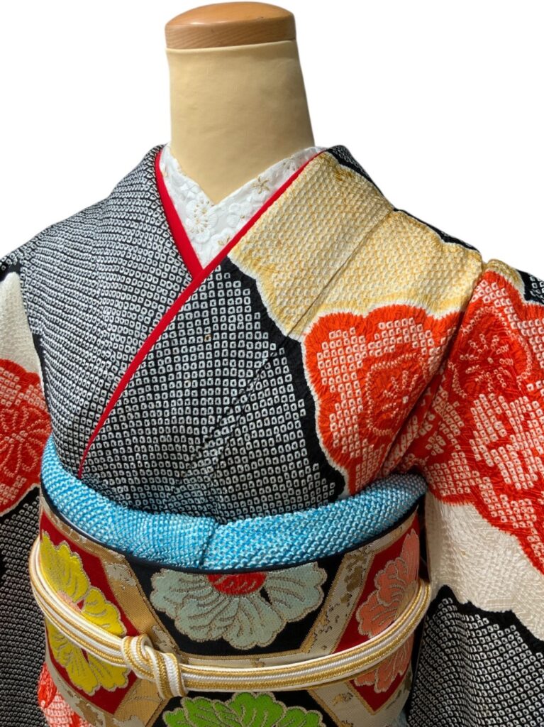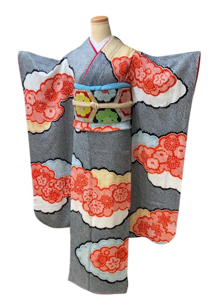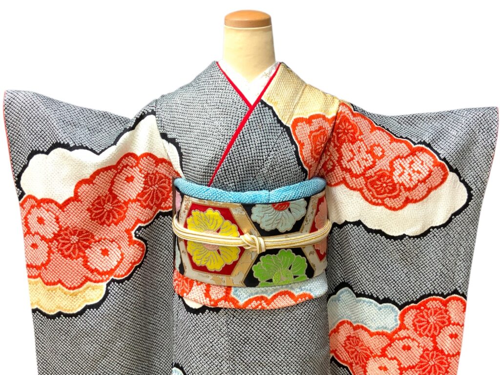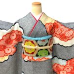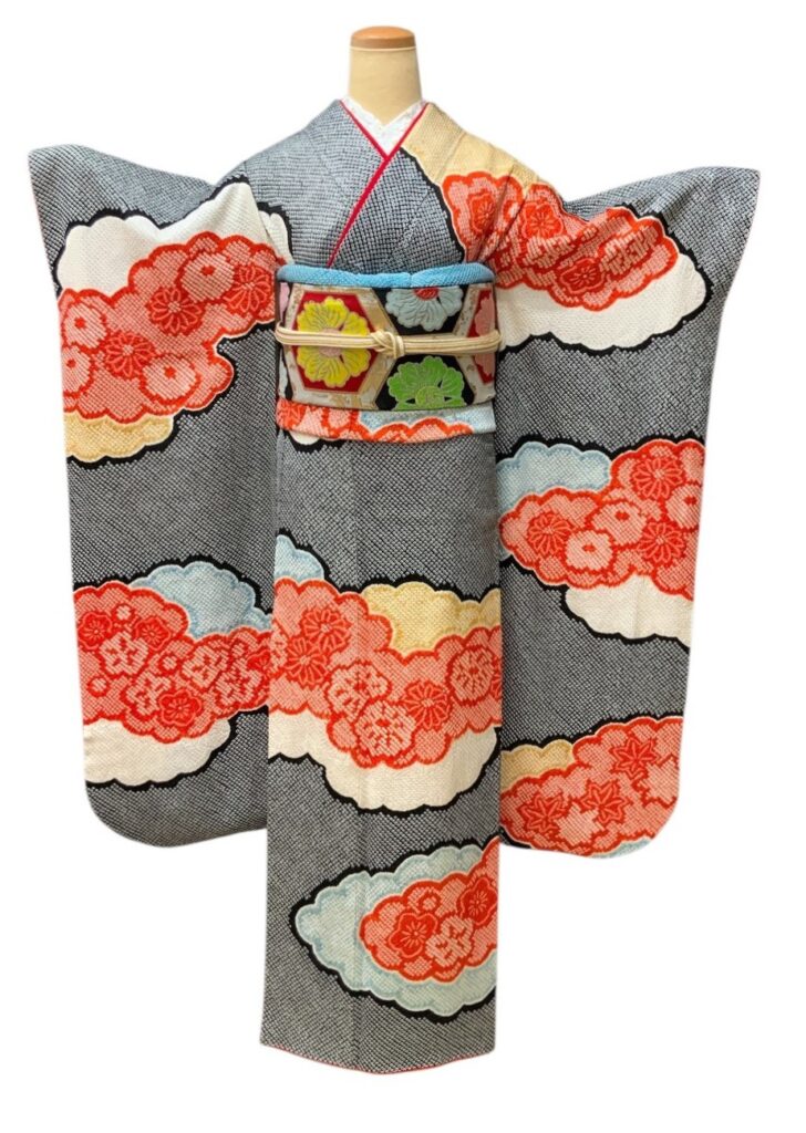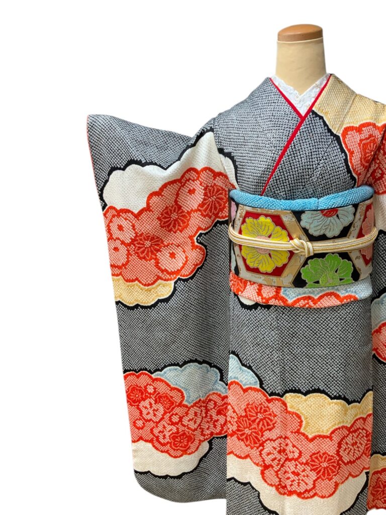 格調高い総絞りの振袖。 緻密な絞りの技法によって生まれる独特の立体感と、 雲取りに咲き誇る花文様が華やぎを添えます。 グレー地に映える赤のアクセントは気品と存在感を兼ね備え、 成人式や前撮りをより一層特別なものにしてくれます 。伝統美とモダンな感覚を併せ持つ、希少な一枚です。 コーディネートは一例です。