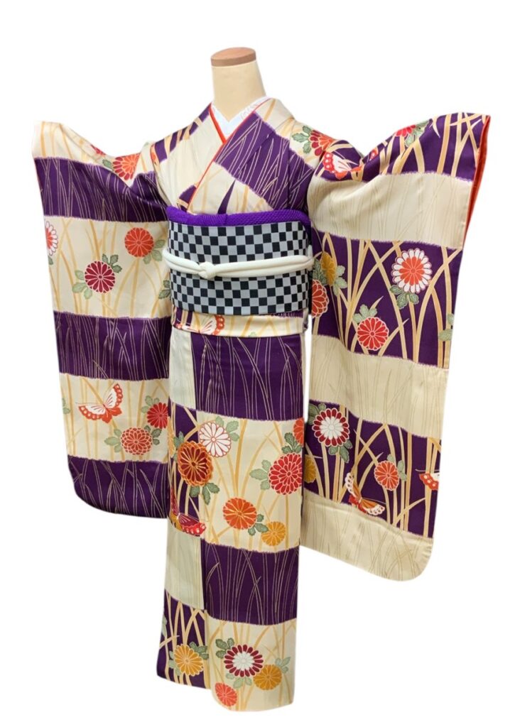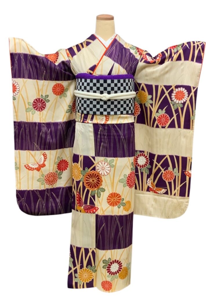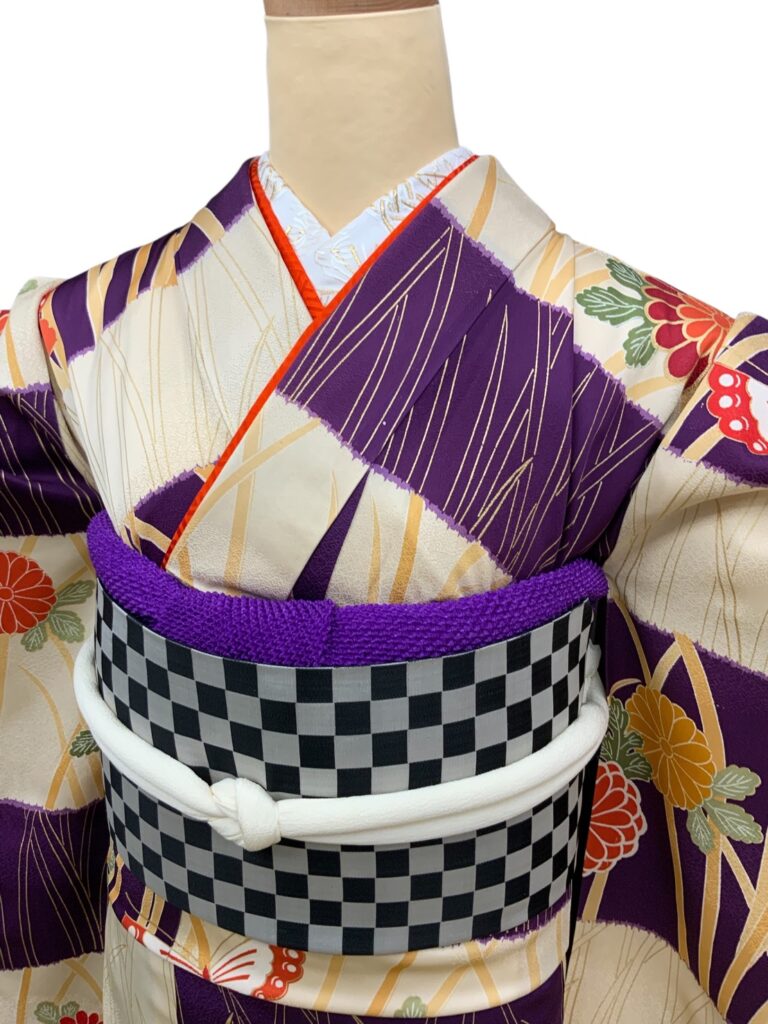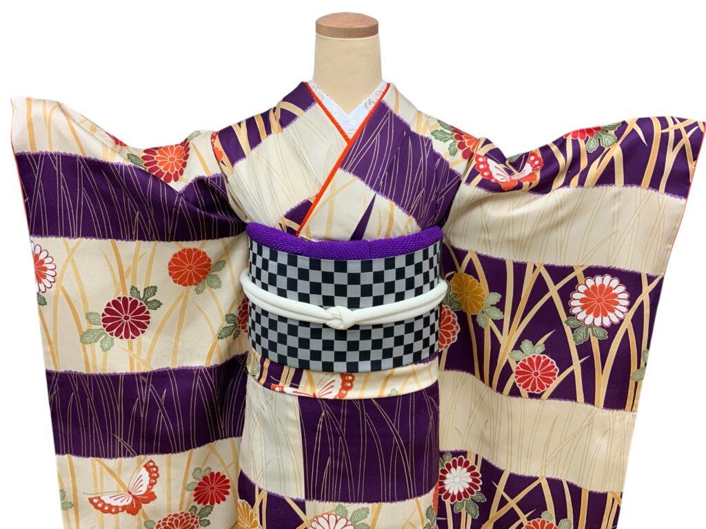 紫と生成りの市松模様に、 菊や桜などの花々が鮮やかに咲き誇る アンティーク調の振袖です。