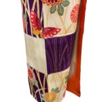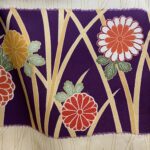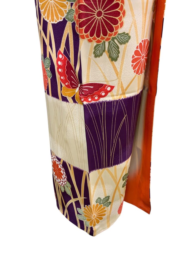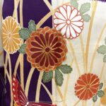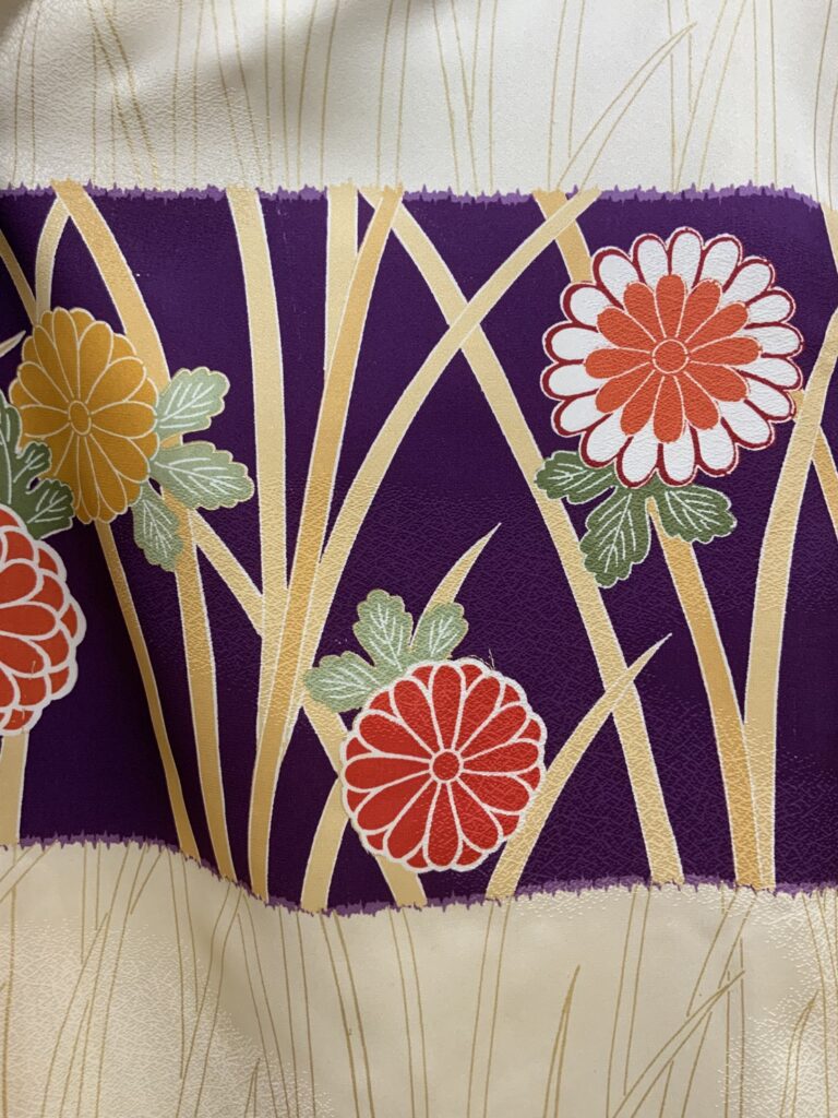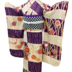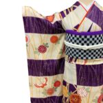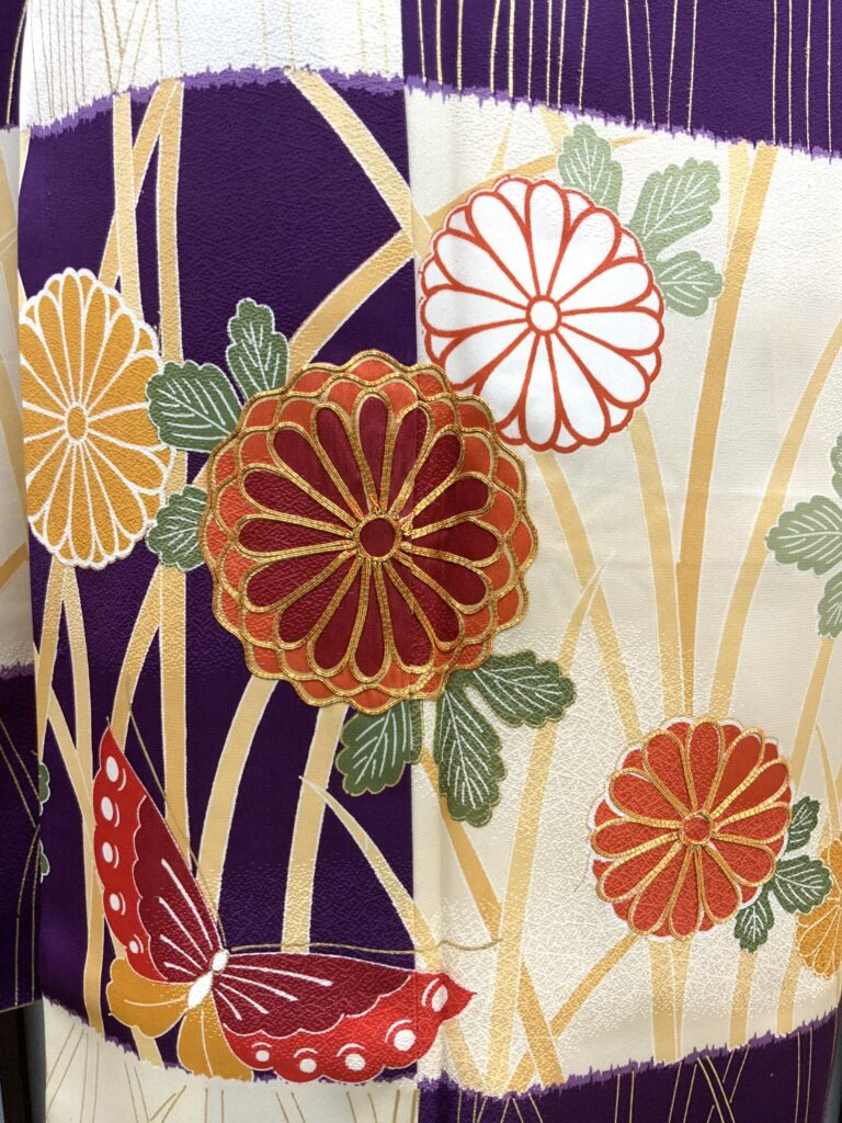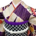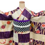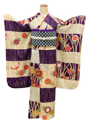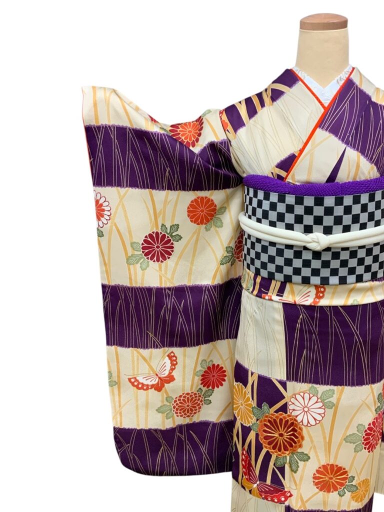 紫と生成りの市松模様に、 菊や桜などの花々が鮮やかに咲き誇る アンティーク調の振袖です。