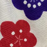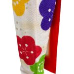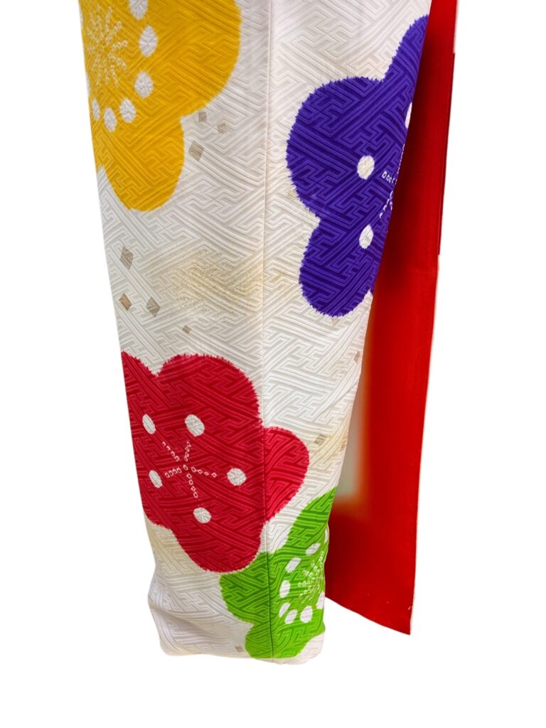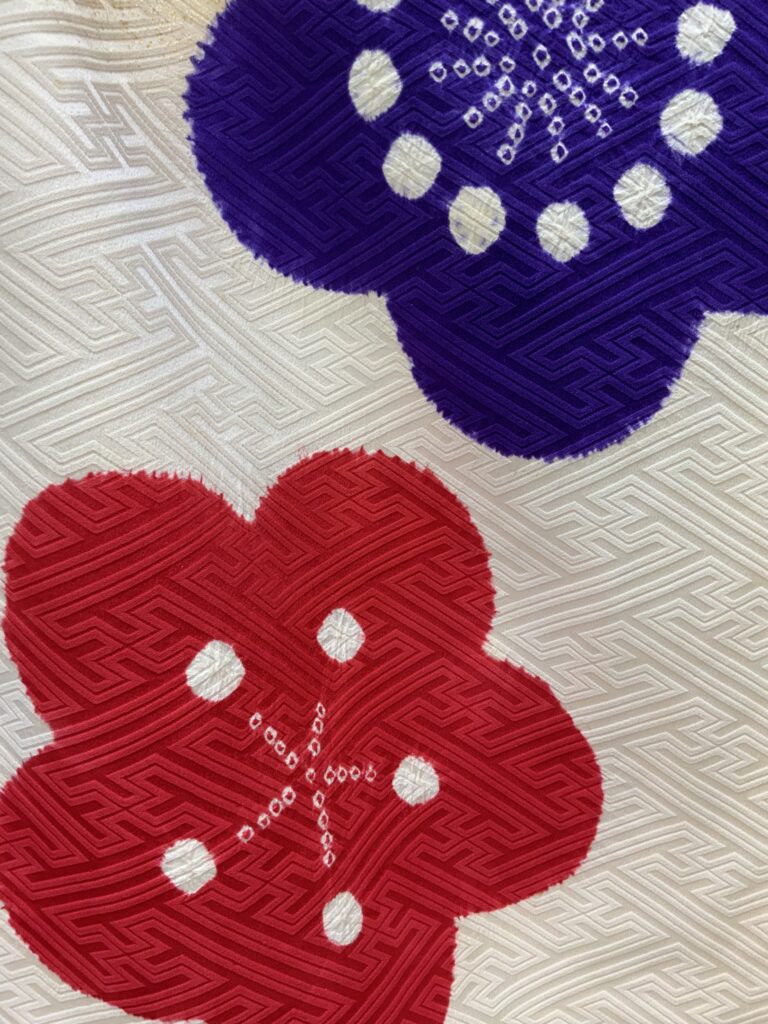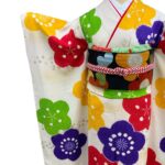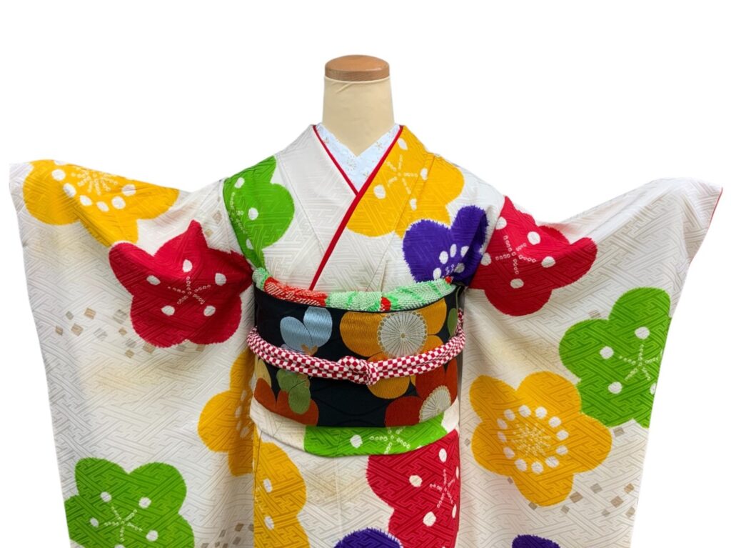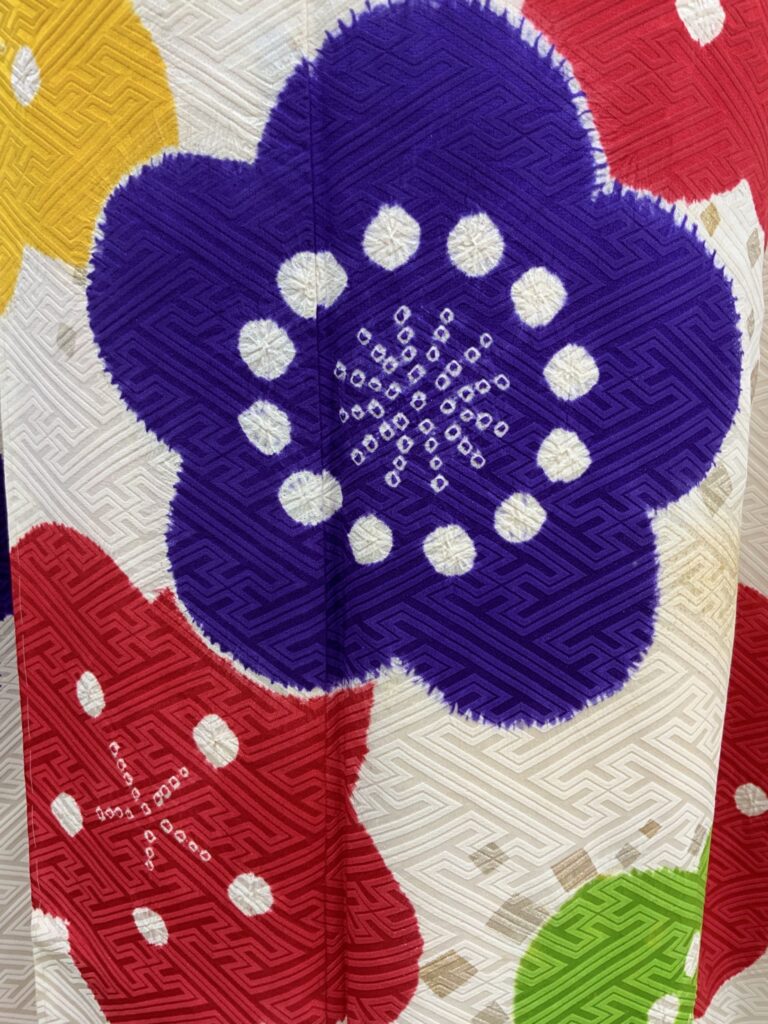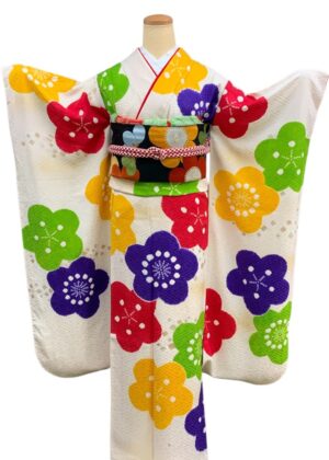 白地にカラフルな梅の花が咲き誇る、