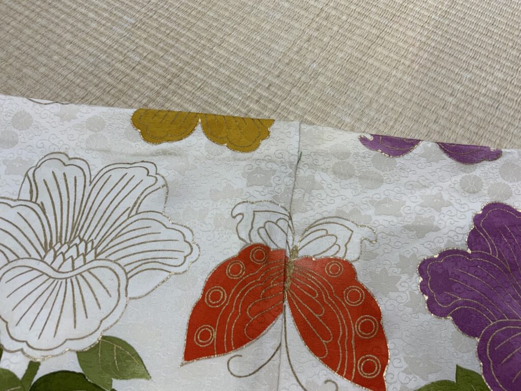 大きめの花文様が全体に配され、 遠目にも美しく華やかな印象を与えます。 お洋服感覚でモダンにおしゃれに着こなしてください。 振袖★★★☆☆Cランク クリーニング済みです。 後ろ肩山少し下にうっすらと線有(画像参照) その他 所々に小さな汚れ有 着用に問題ございません →当店の状態ランクについて