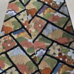 大胆な幾何学模様に、 赤・青・緑など色鮮やかな花文様が映える絞り振袖です。 深みのある葡萄色を効かせたデザインが、 全体を上品かつ華やかに引き締めています。 しっかりとした絞りの風合いと、 立体感のある柄行きが特徴で、 成人式や晴れの日にふさわしい一枚。 帯は唐織りで、じぅゆこうかんをアップ