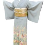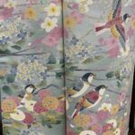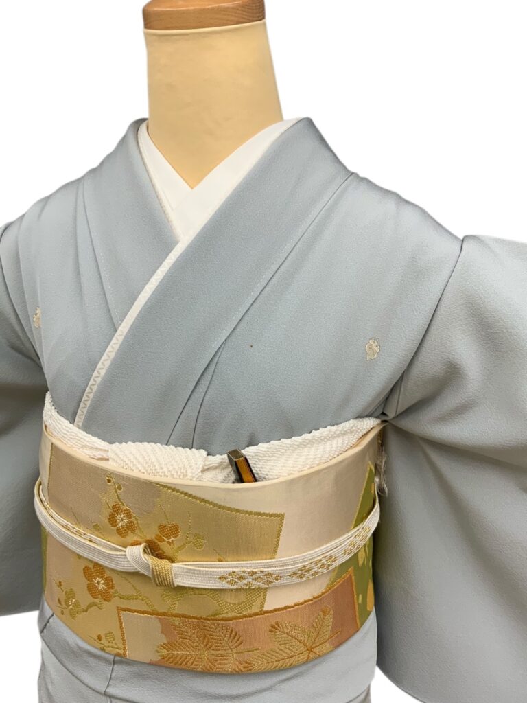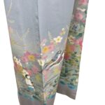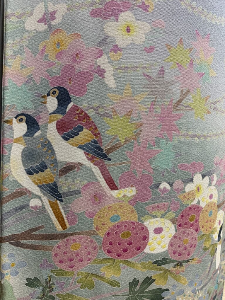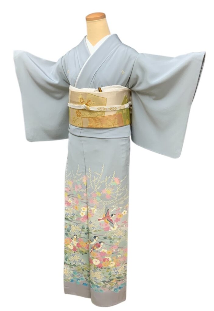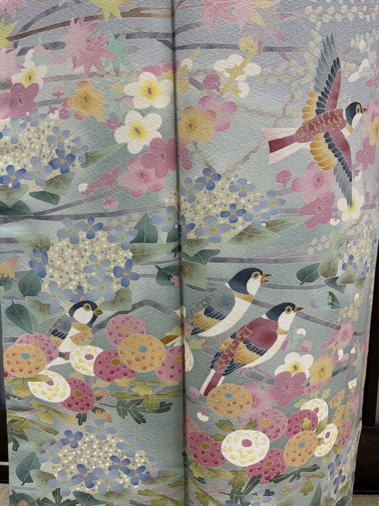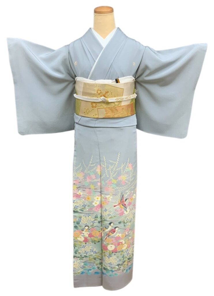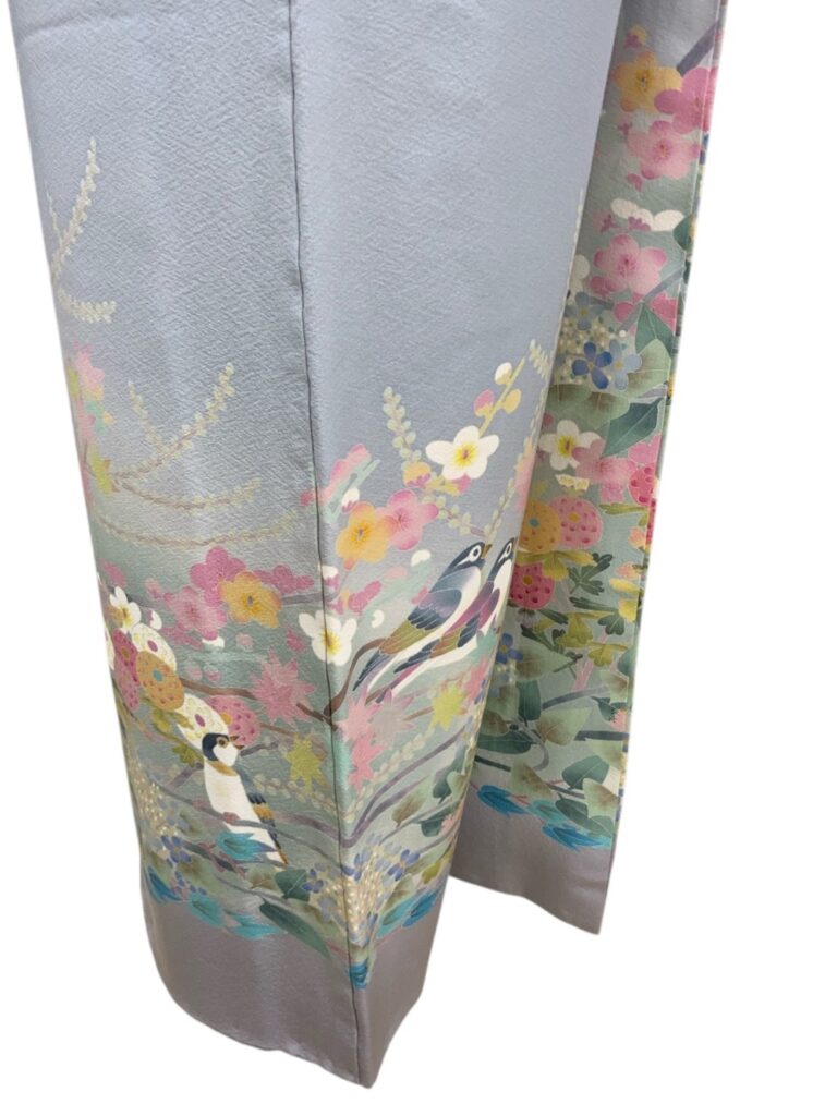 やわらかなグレーがかった水色の地に、四季の花々と愛らしい鳥たちを描いた上品な色留袖。