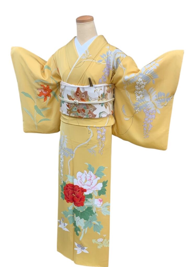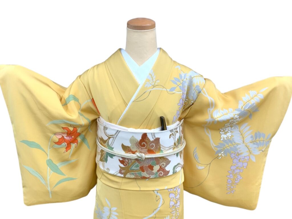 しっとりとした質感の絹に映えるクリームイエローの地色が上品な訪問着。