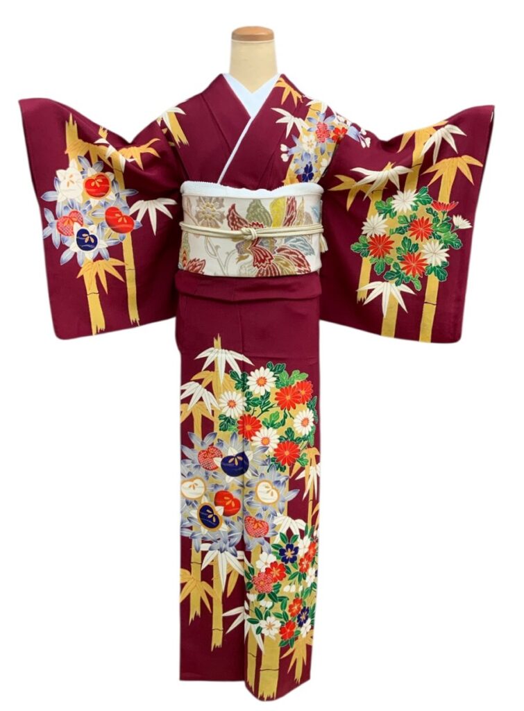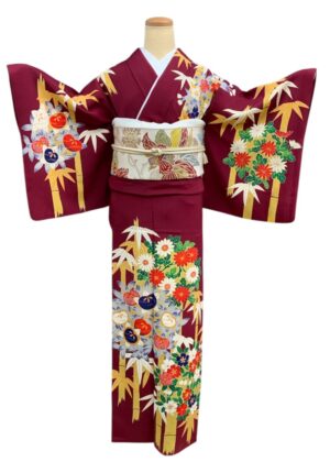 上質のちりめん生地に深みあるえんじ色がしっとりとした雰囲気を醸す訪問着。丸い花輪のはんなりとした意匠に、竹の伸びやかな縦ラインが加わることで甘くなり過ぎず大人の雰囲気に仕上がっています。手描き友禅の温もりある筆致は、どことなくシックでレトロ。金のラインで柄の輪郭を描くことで、より一層、柄行に存在感を感じさせます。東京友禅作家の浦野理一氏の逸品です。