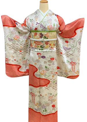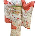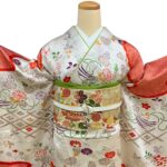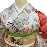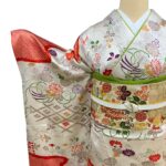 松竹梅や菊、橘、鼓などの吉祥柄が描かれ、華やかさと上品さを兼ね備えた一着です。