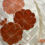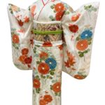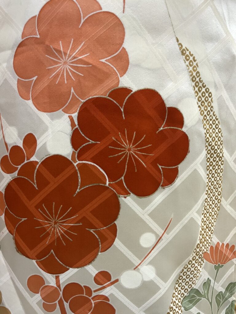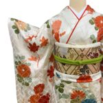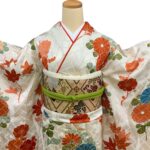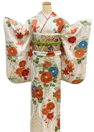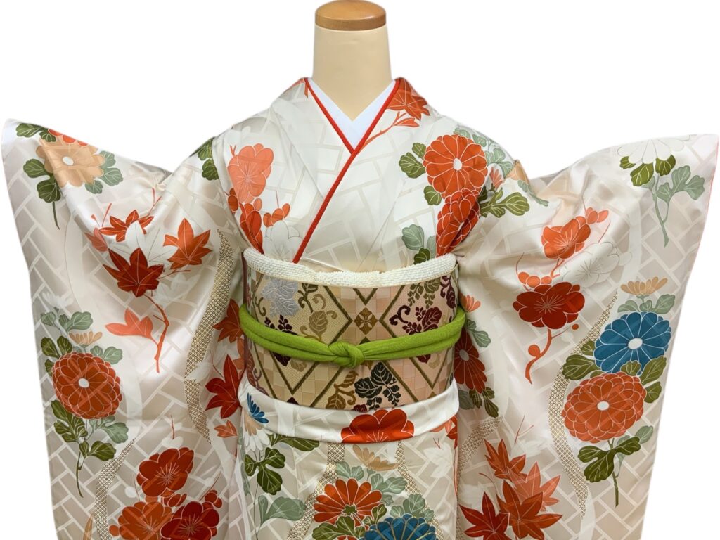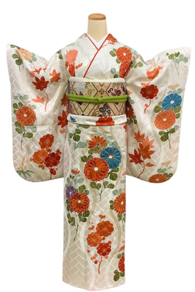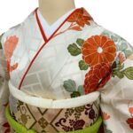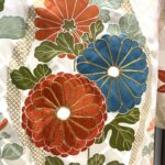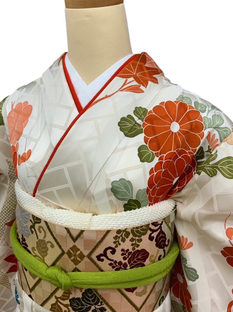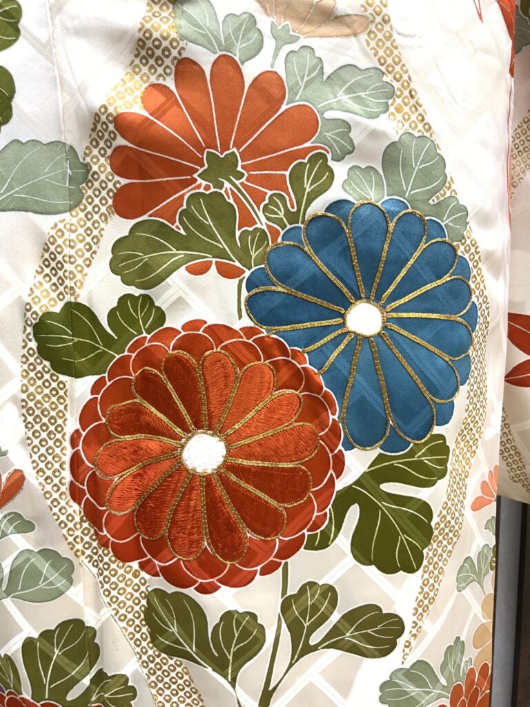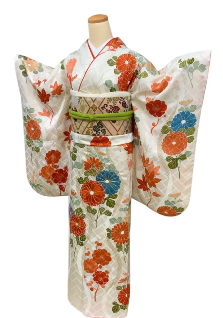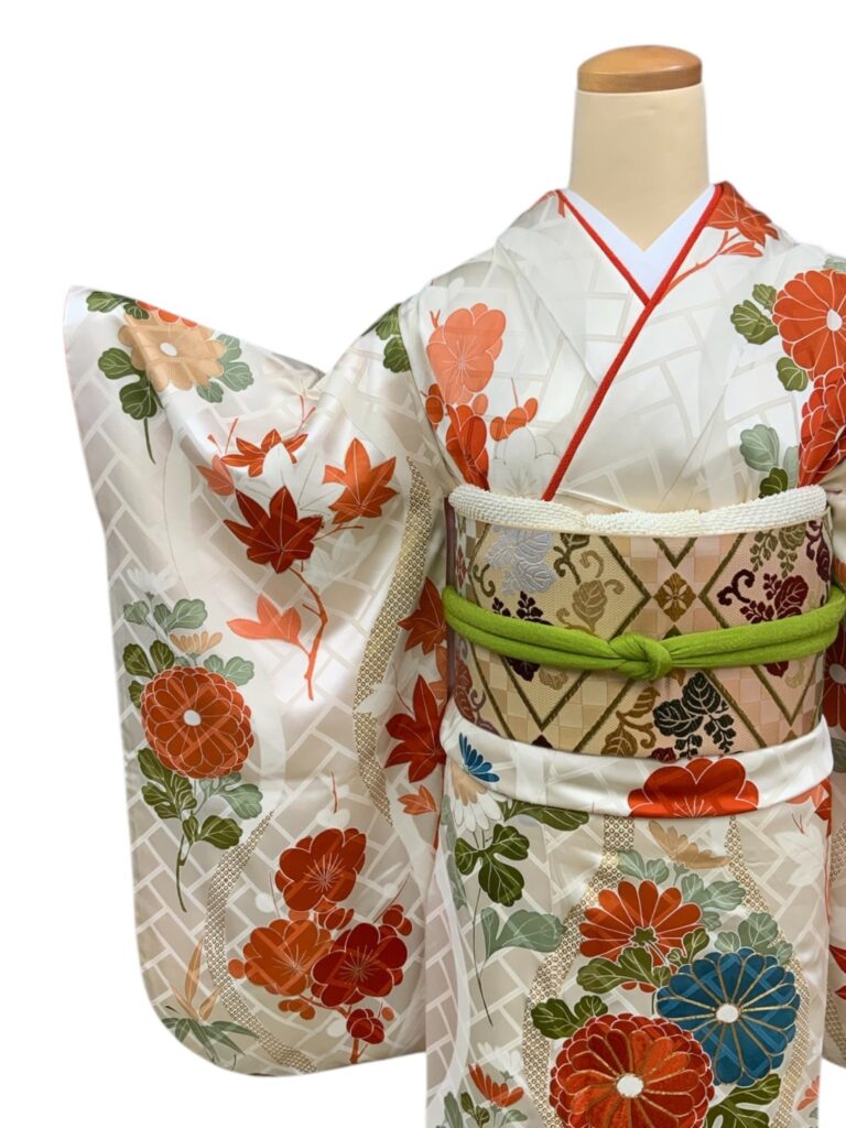 生成りの地に、大輪の菊や紅葉が咲き誇る華やかな訪問着。