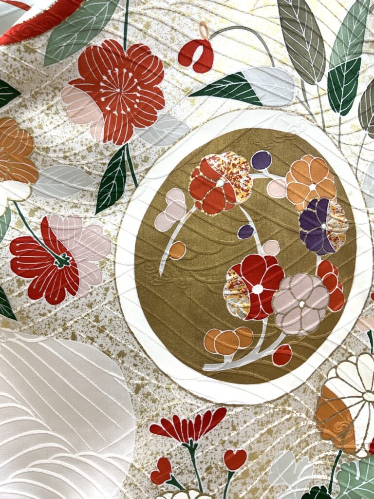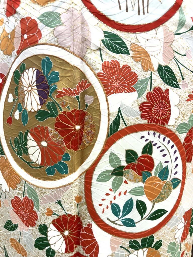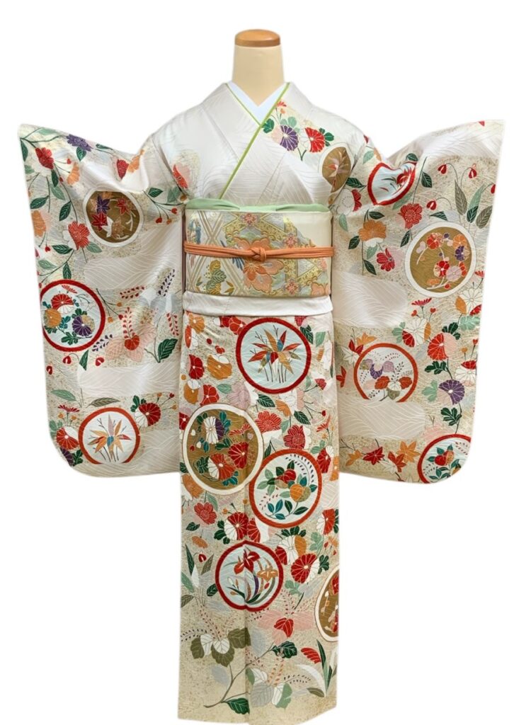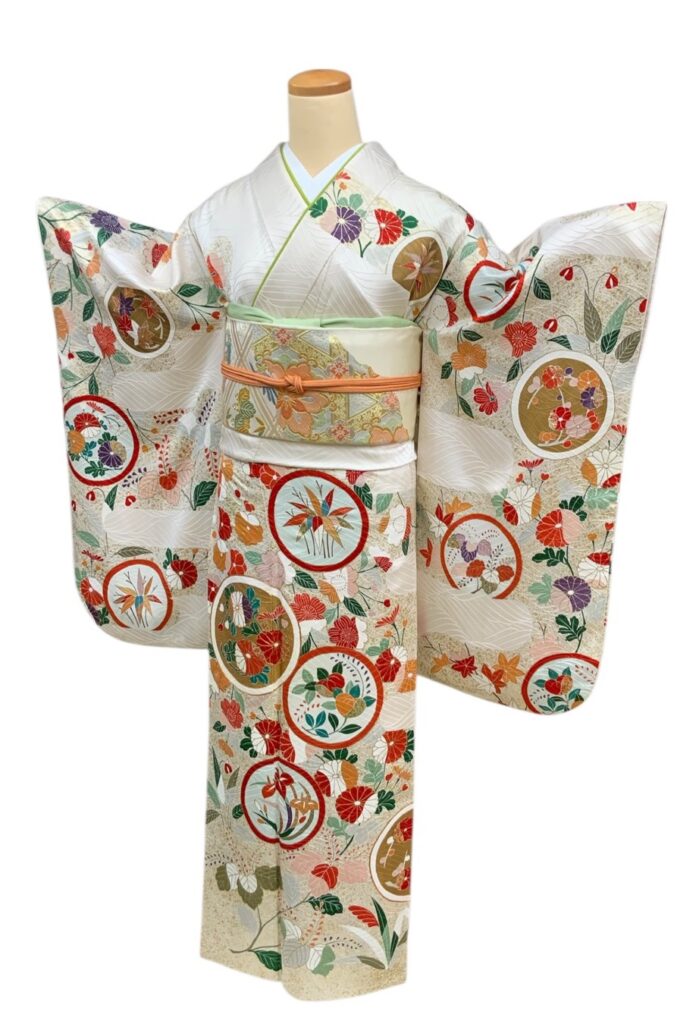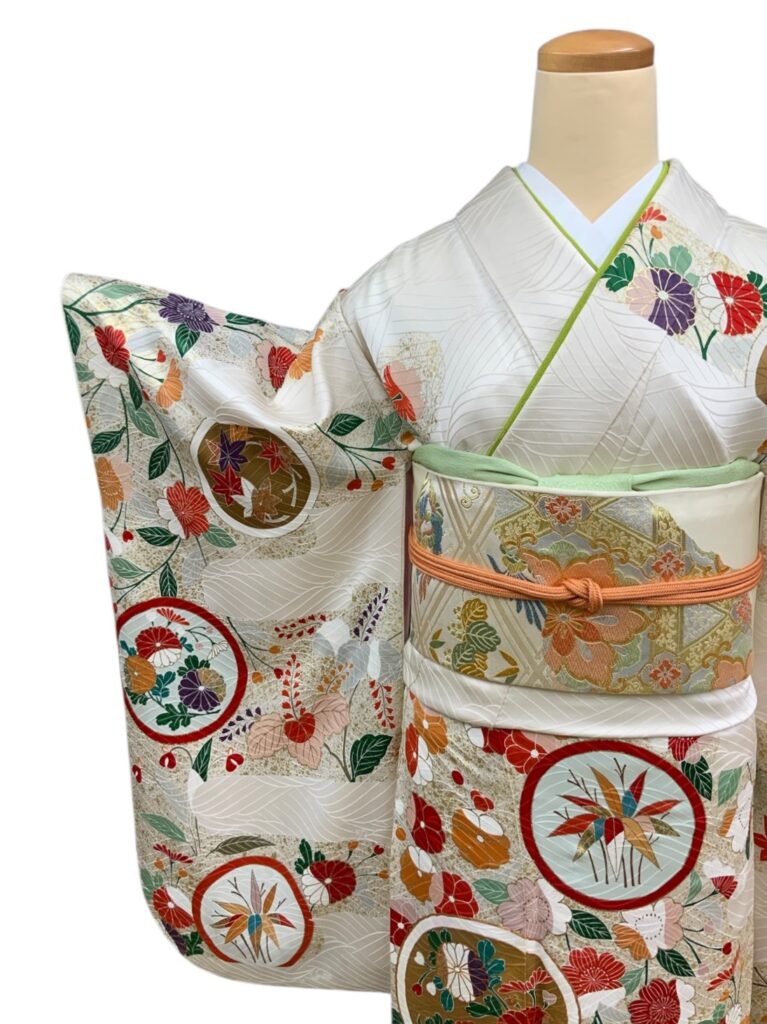 雅やかな円文に四季の花々と御所車が描かれた、格調高い訪問着。