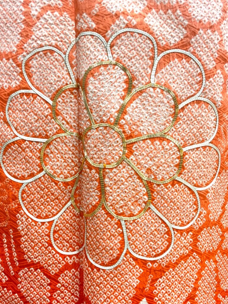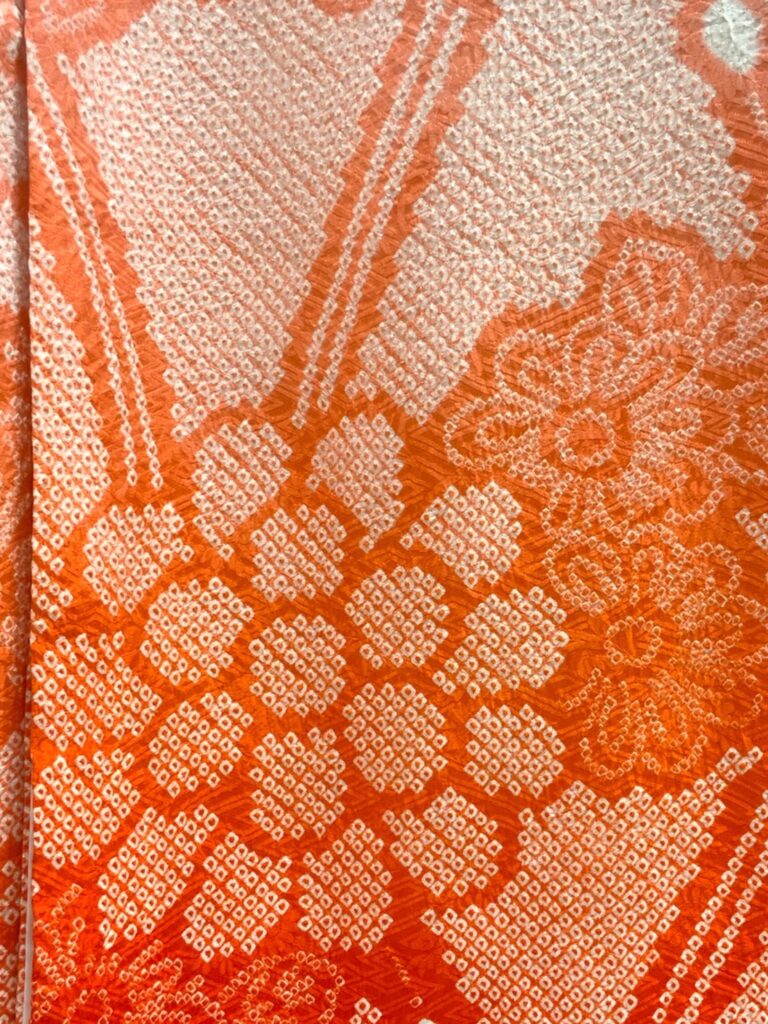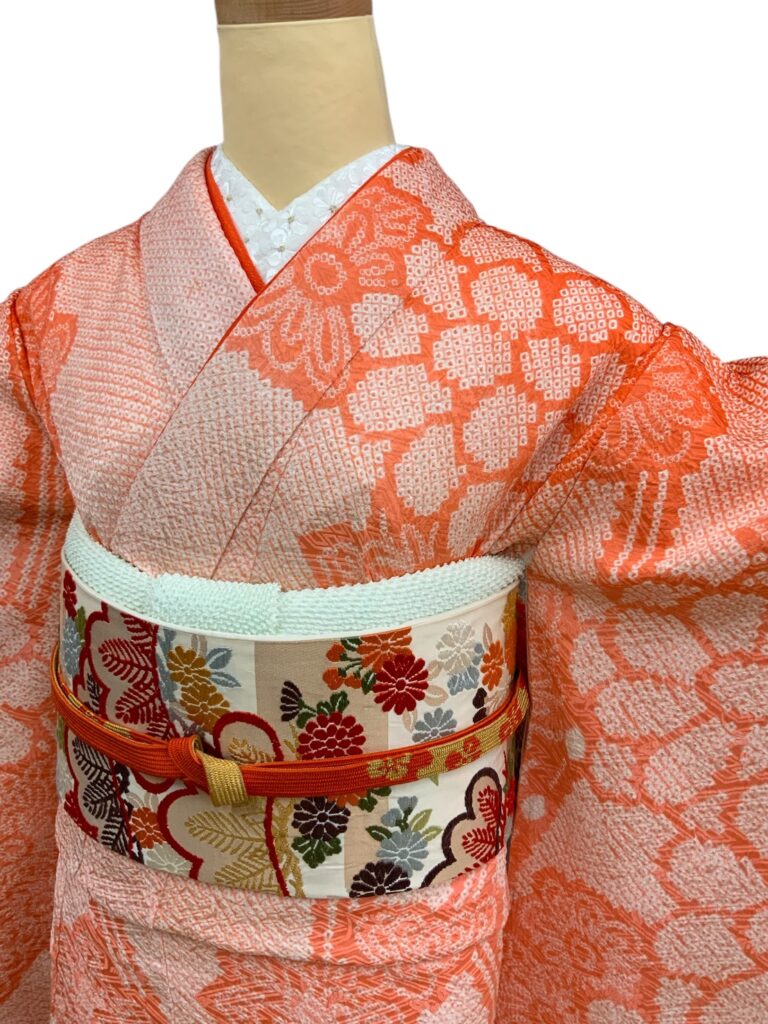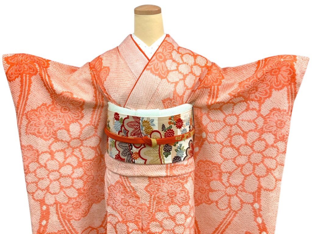 【サイズ】 身丈:155cm(背から) 袖丈:101.5cm 裄丈:65.5cm 帯長さ:426㎝ 帯幅:31㎝ 適応身長:158㎝くらいまで