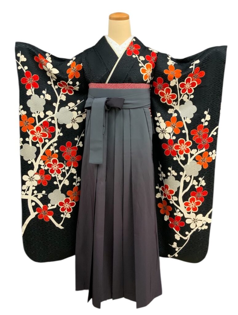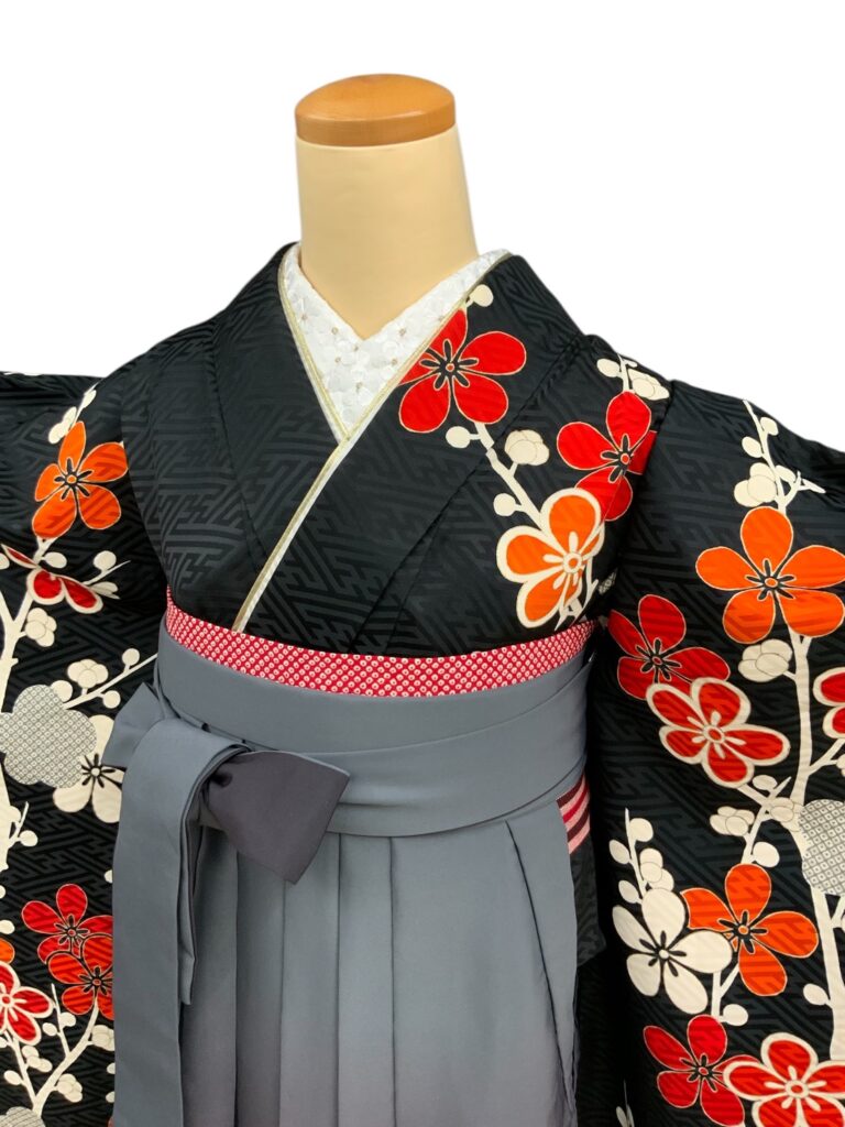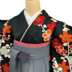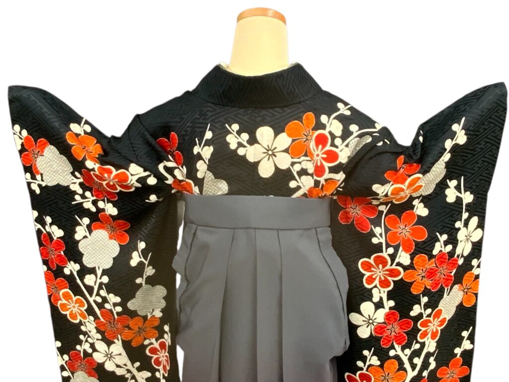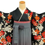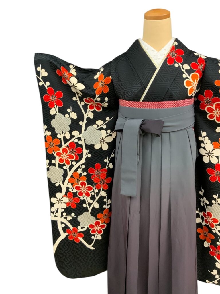 一瞬で目を惹く黒地の梅柄に、上品なグレー袴を合わせた人気コーディネート。