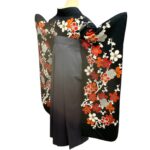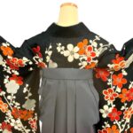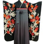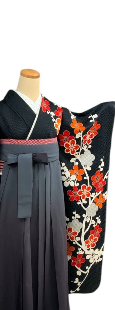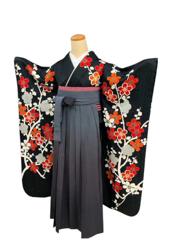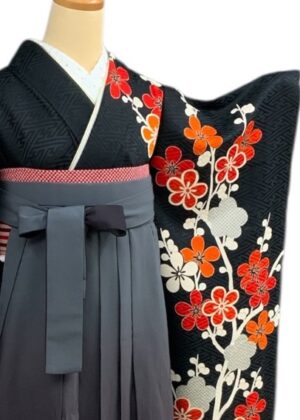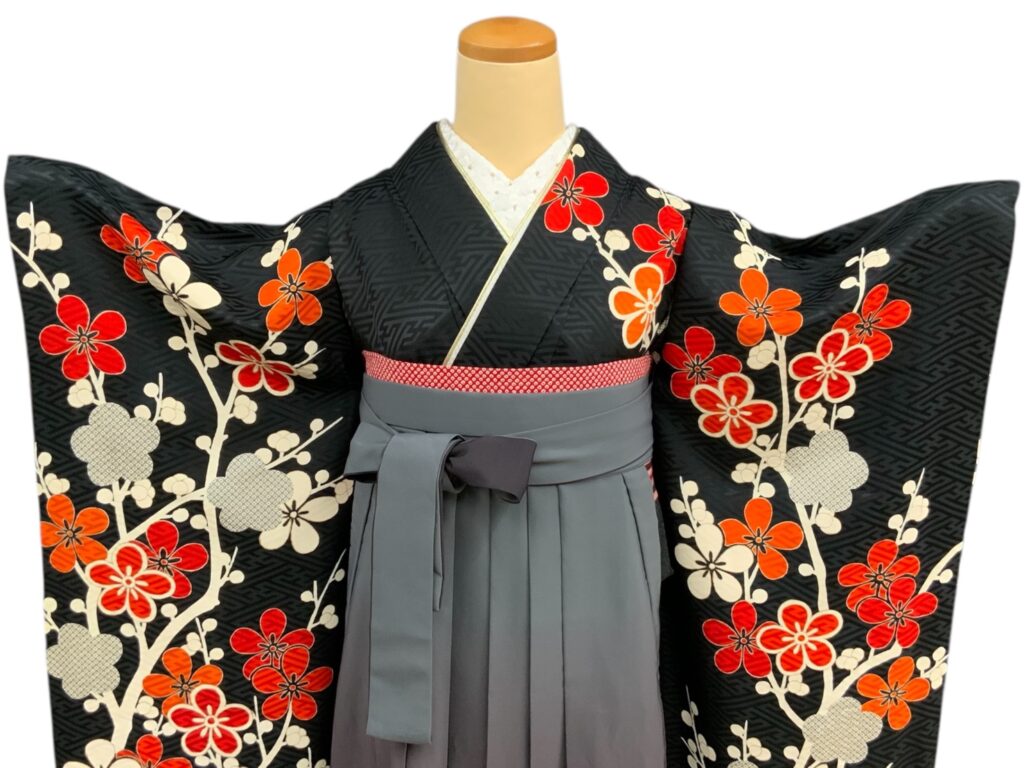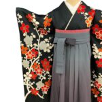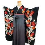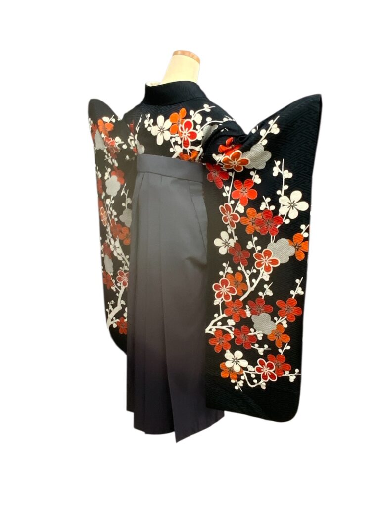 一瞬で目を惹く黒地の梅柄に、上品なグレー袴を合わせた人気コーディネート。