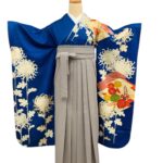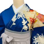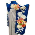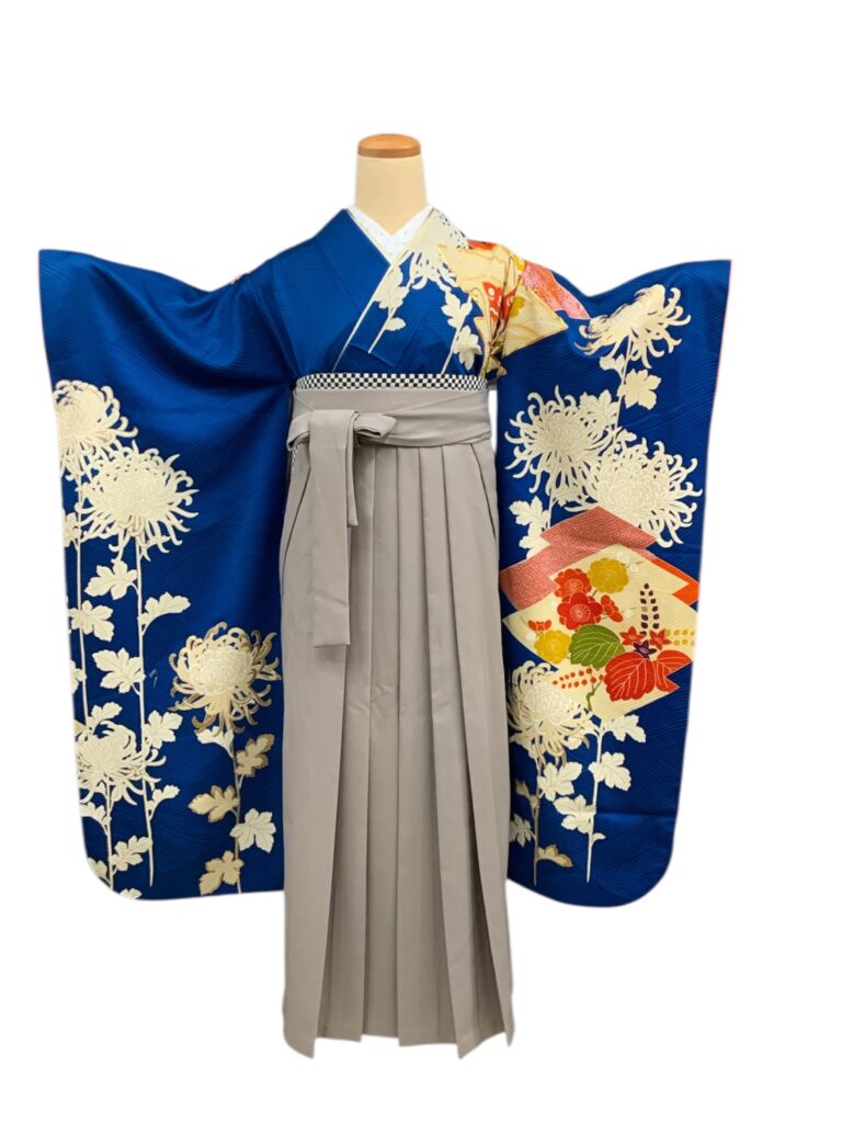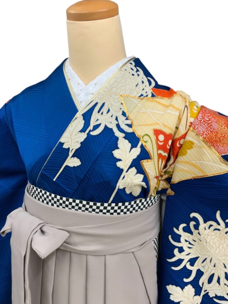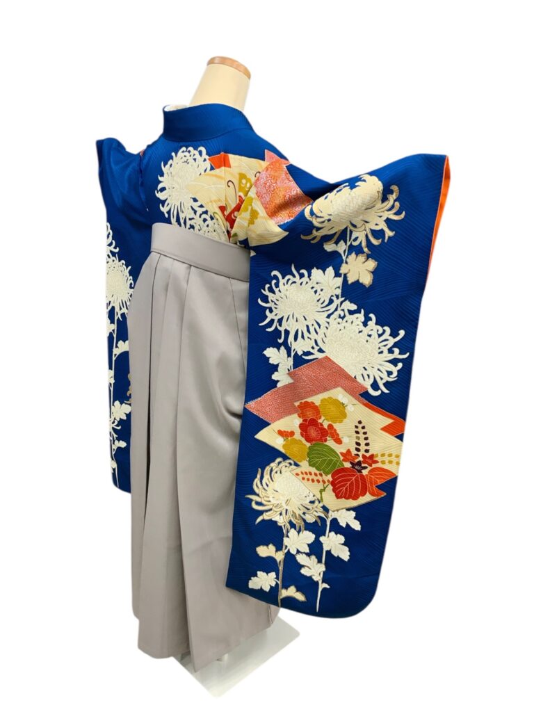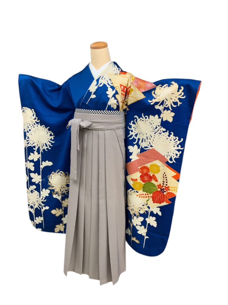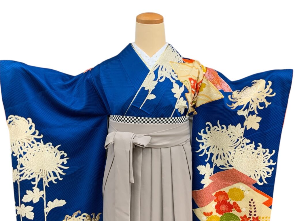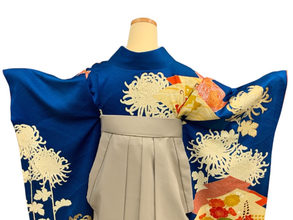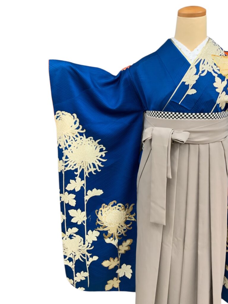 白く浮かび上がる菊の花が美しい着物に、