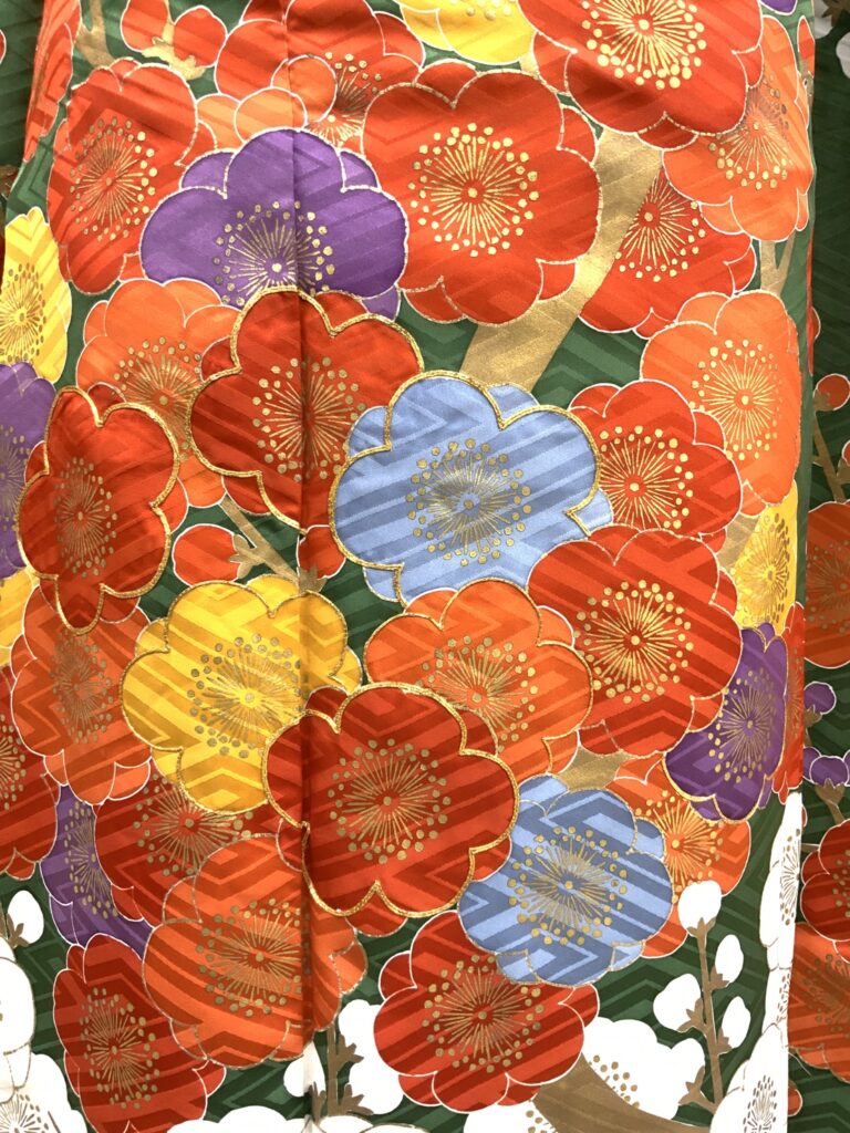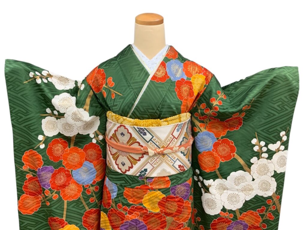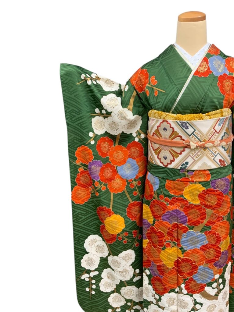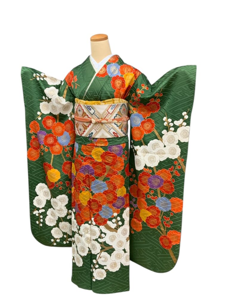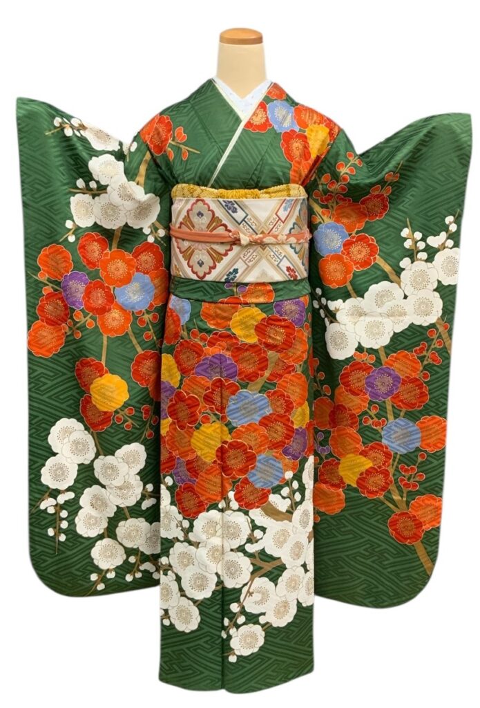 深緑の地色に、紅白橙の梅が咲き誇る華やかな古典振袖。