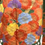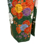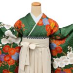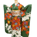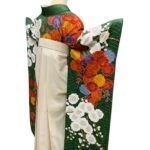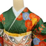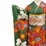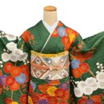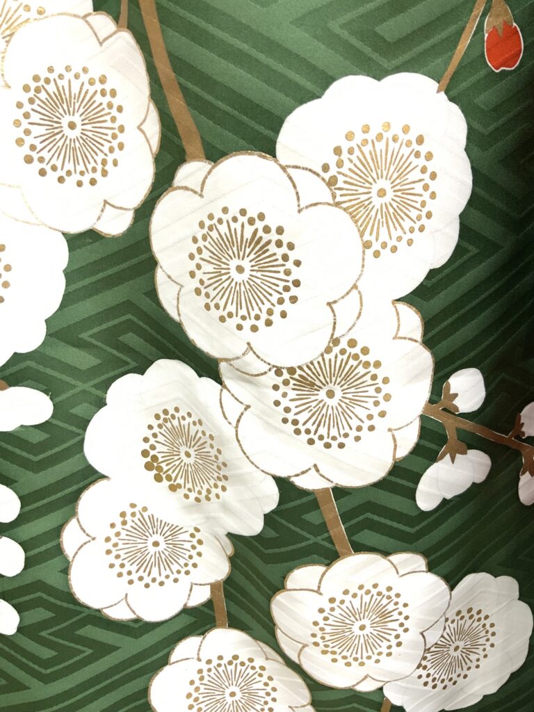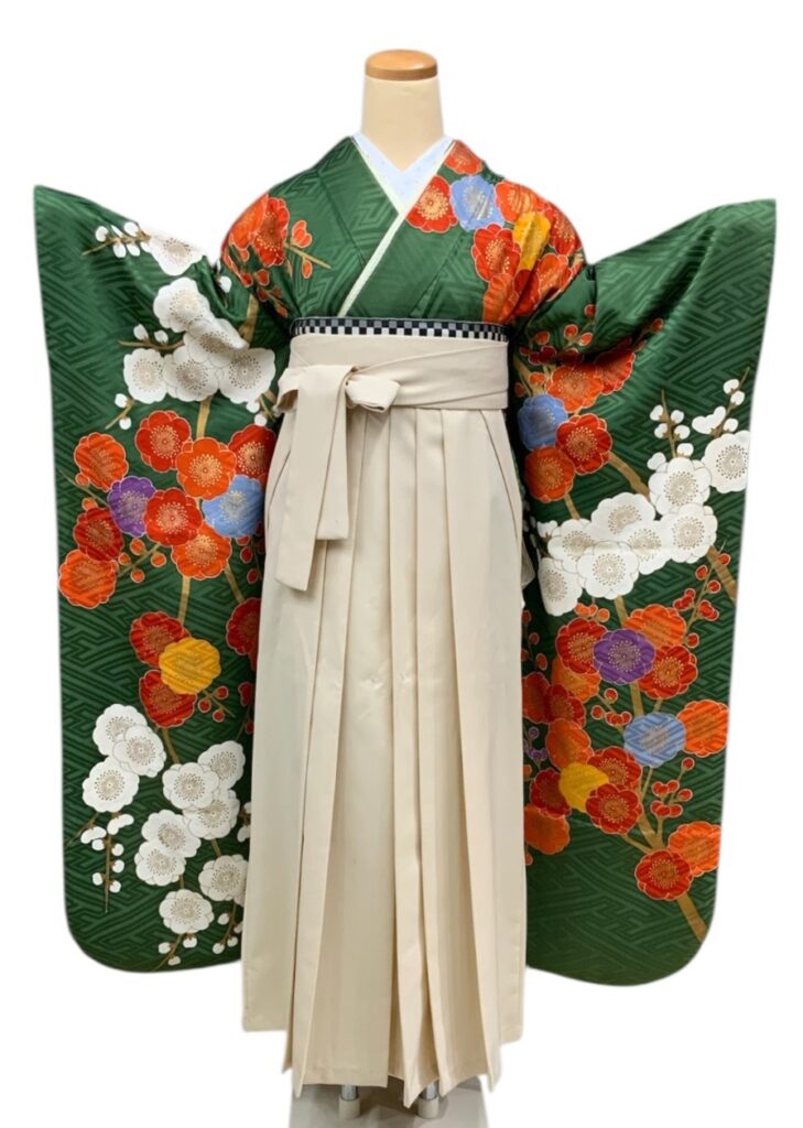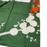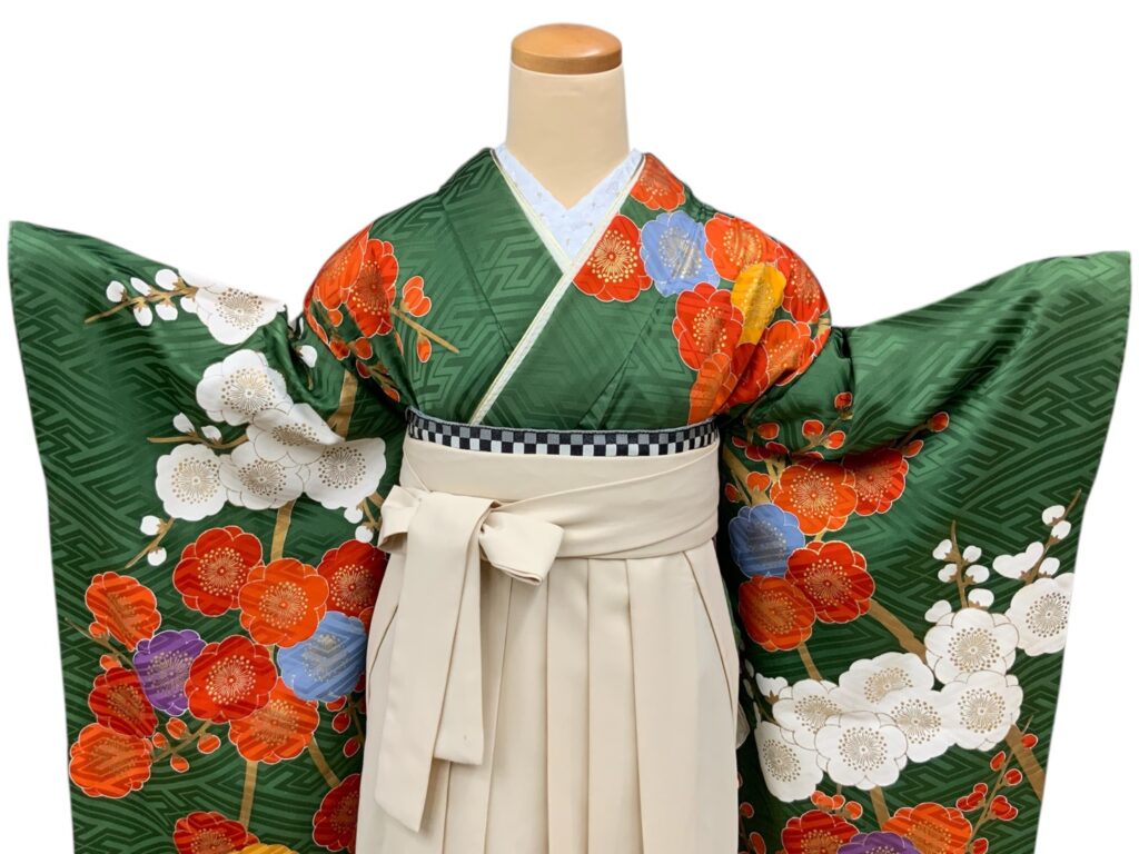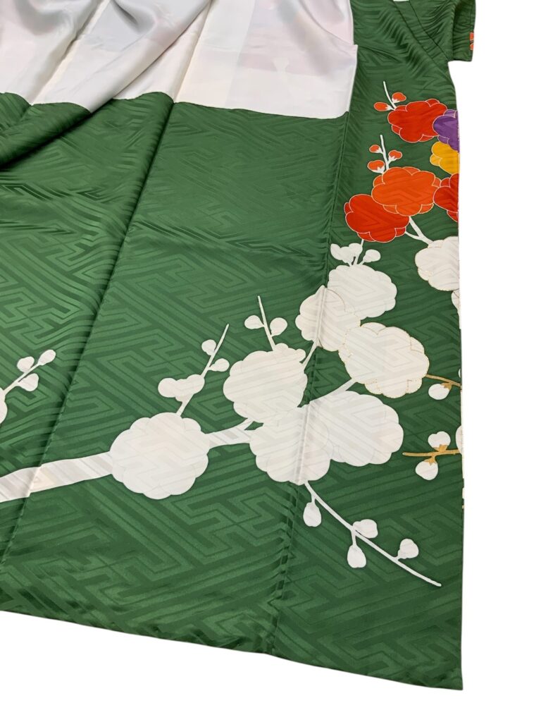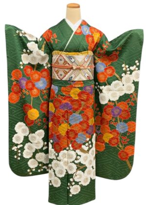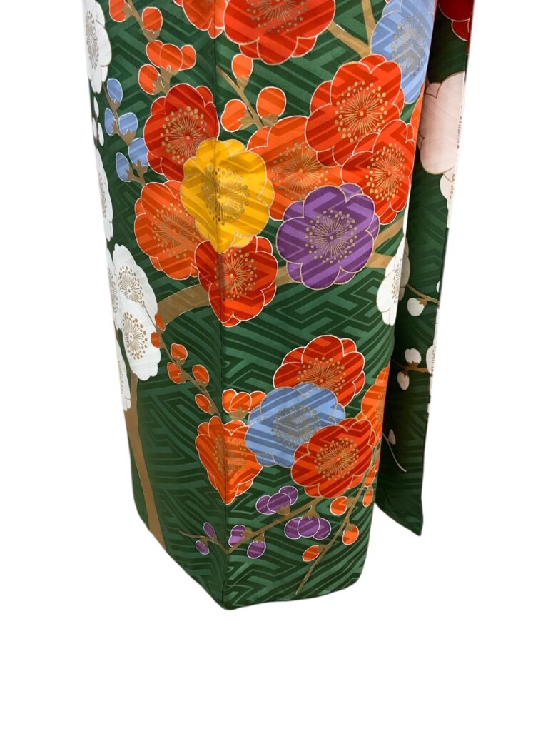 深緑の地色に、紅白橙の梅が咲き誇る華やかな古典振袖。